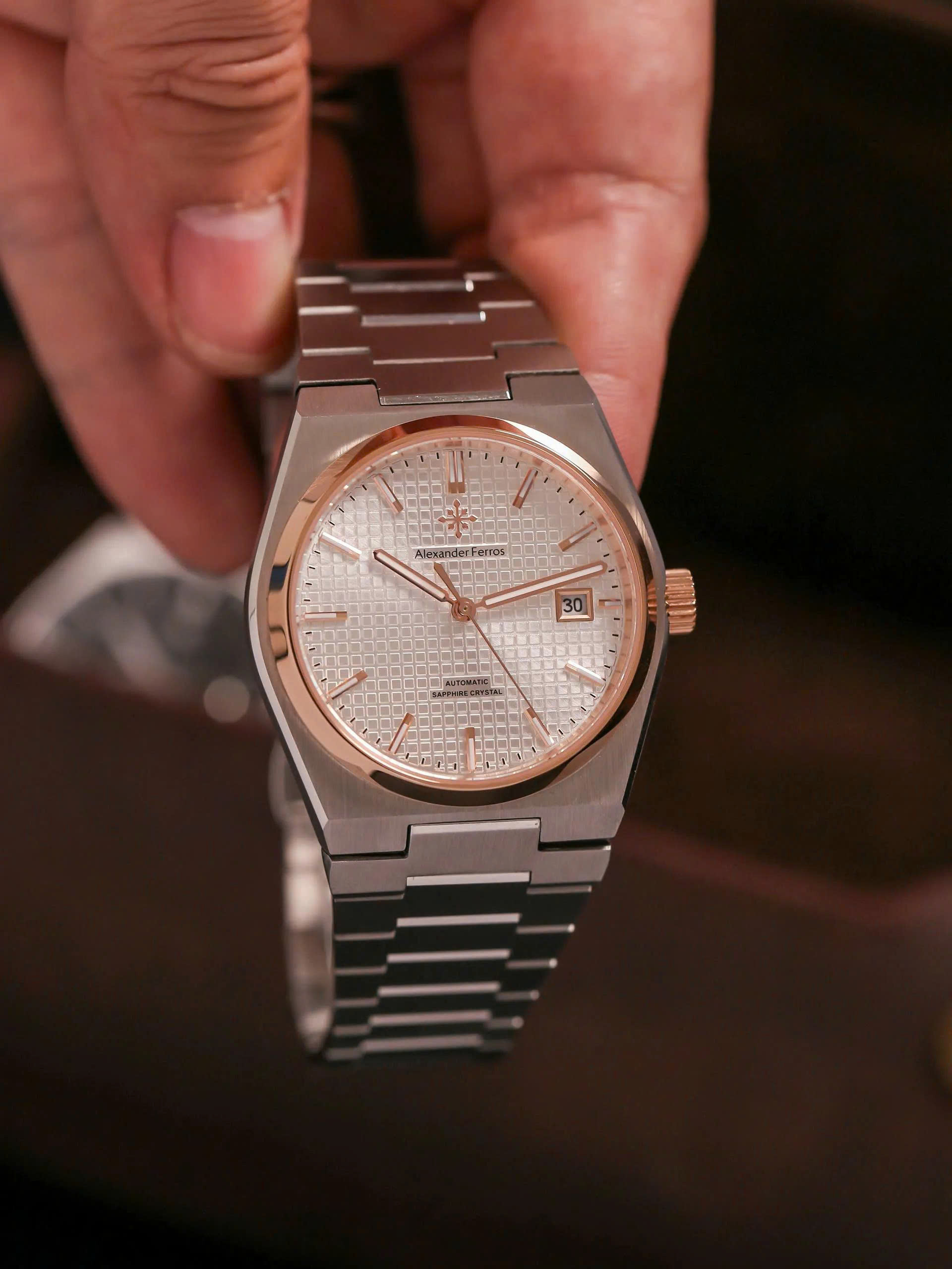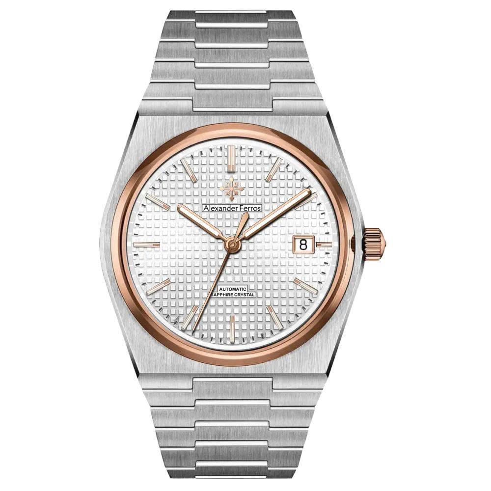 Đồng hồ Alexander Ferros 5052D/02 sở hữu thiết kế tinh tế với sự kết hợp hài hòa giữa sắc bạc và viền vàng hồng sang trọng. Mặt số màu trắng trang nhã được tạo điểm nhấn bằng họa tiết caro tinh xảo, cùng bộ kim và cọc số mảnh mạ vàng hồng tạo nên vẻ ngoài thanh lịch.