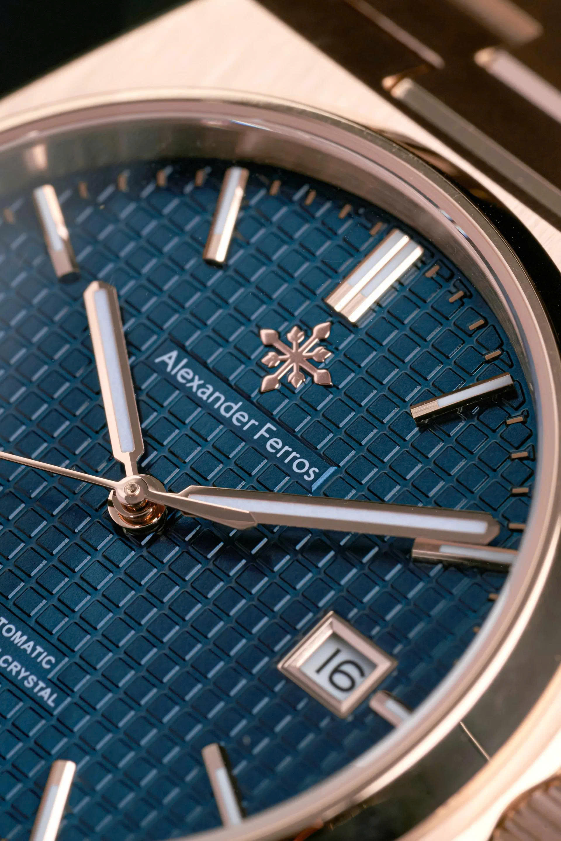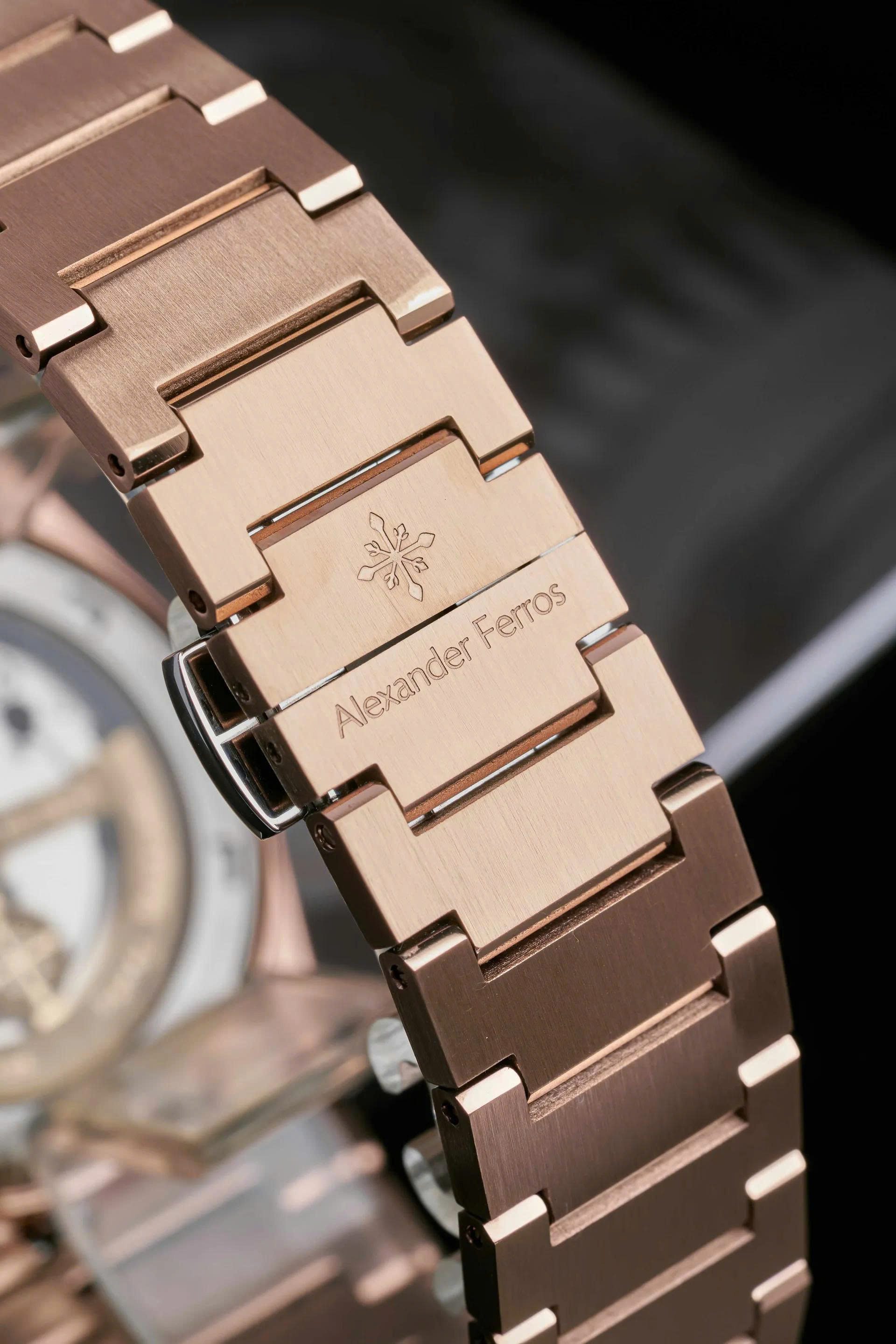 Alexander Ferros 5052 nổi bật với thiết kế tinh xảo, kết hợp giữa phong cách cổ điển và hiện đại. Vỏ đồng hồ được chế tác từ thép không gỉ cao cấp, chống trầy xước, bền bỉ với thời gian. Mặt kính sapphire trong suốt, chống lóa, bảo vệ cơ chế bên trong.