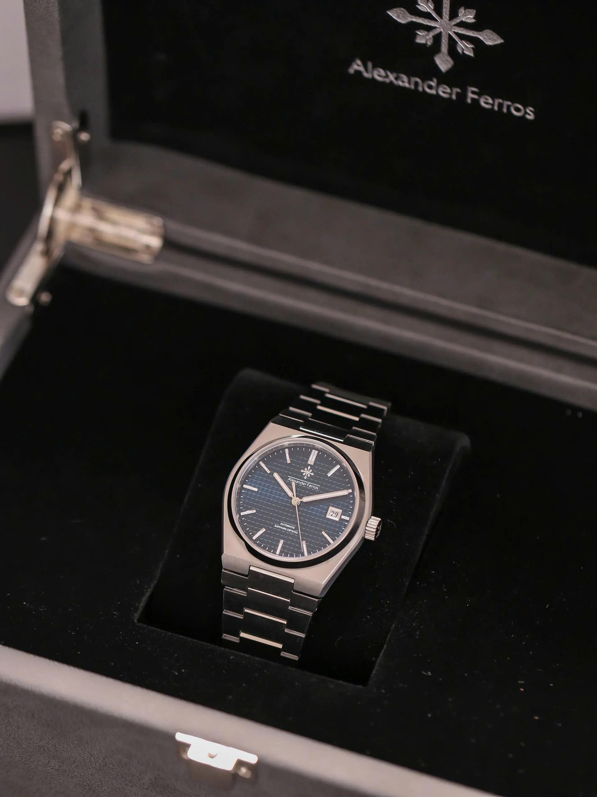 Alexander Ferros 5052 nổi bật với thiết kế tinh xảo, kết hợp giữa phong cách cổ điển và hiện đại. Vỏ đồng hồ được chế tác từ thép không gỉ cao cấp, chống trầy xước, bền bỉ với thời gian. Mặt kính sapphire trong suốt, chống lóa, bảo vệ cơ chế bên trong.