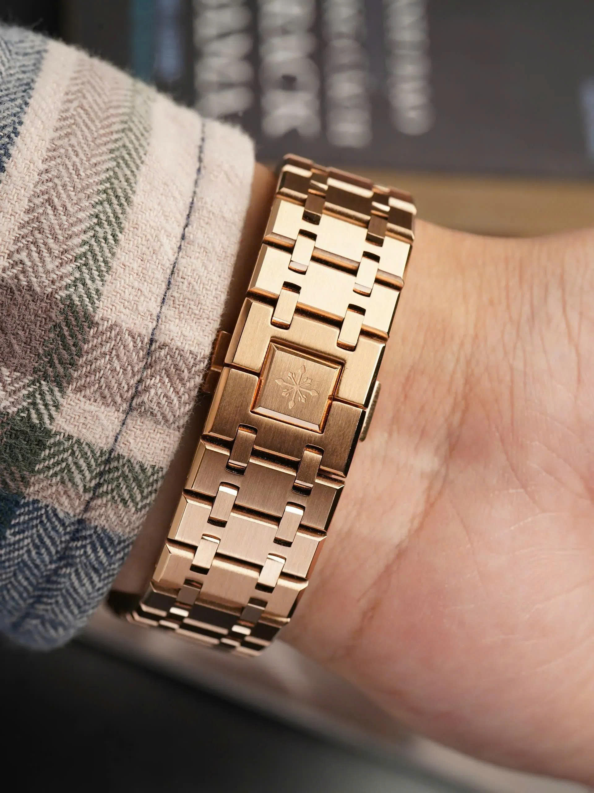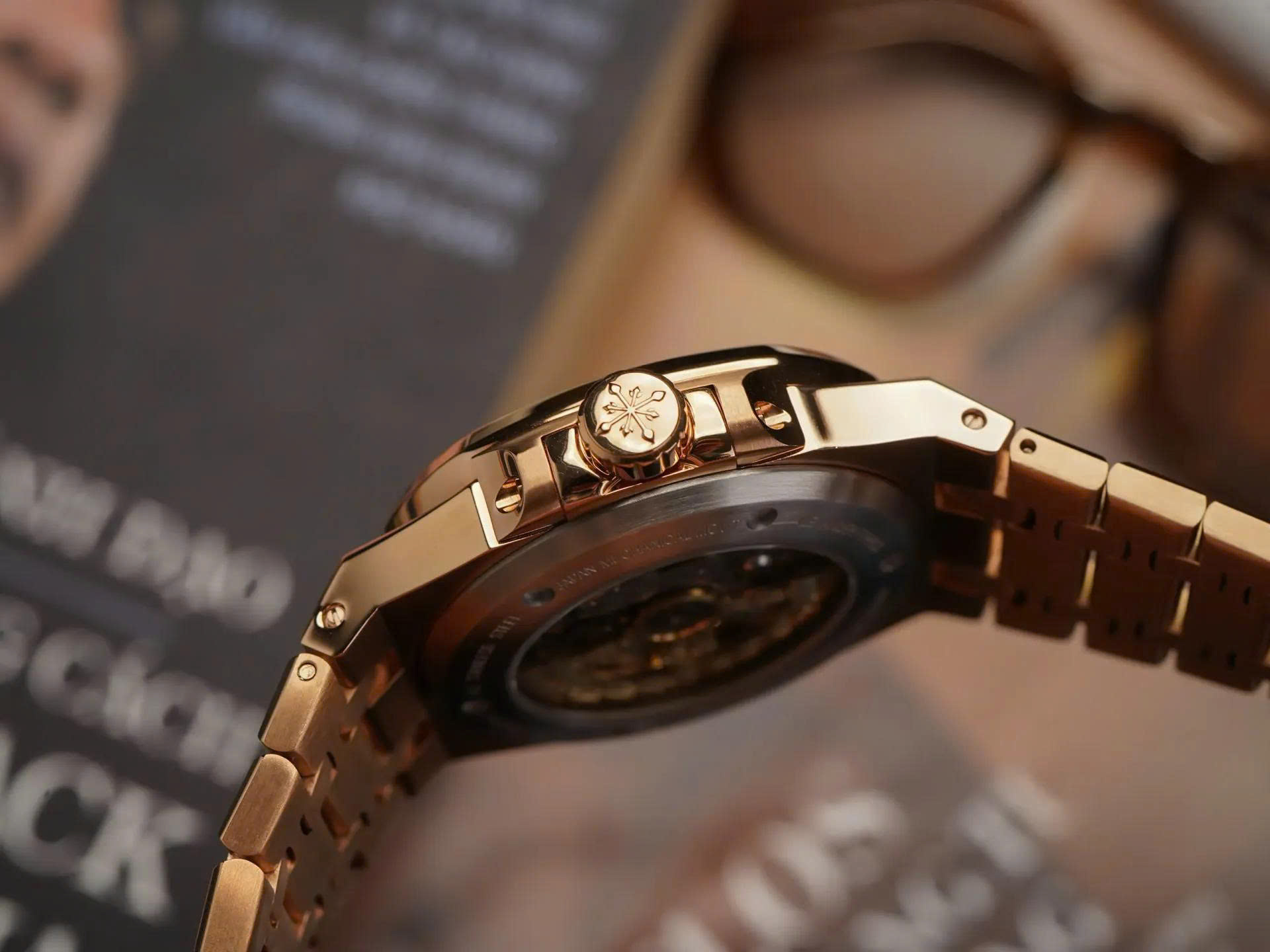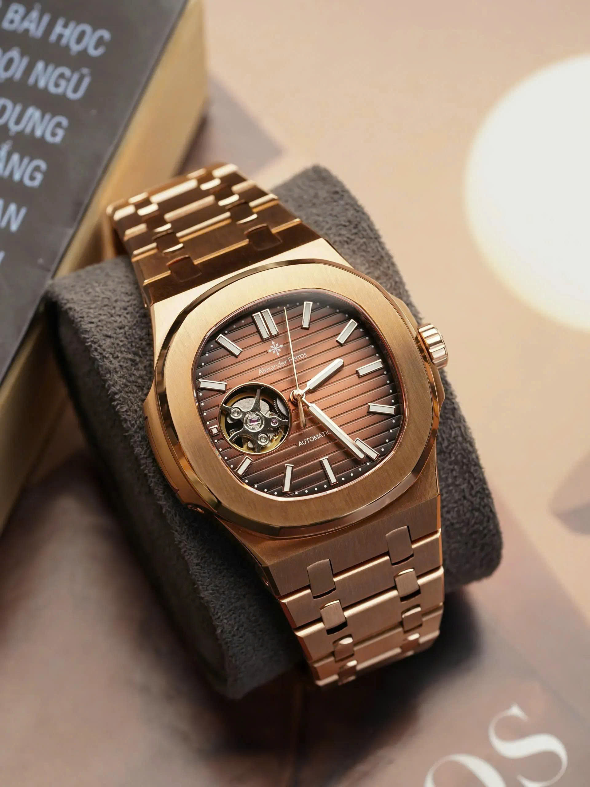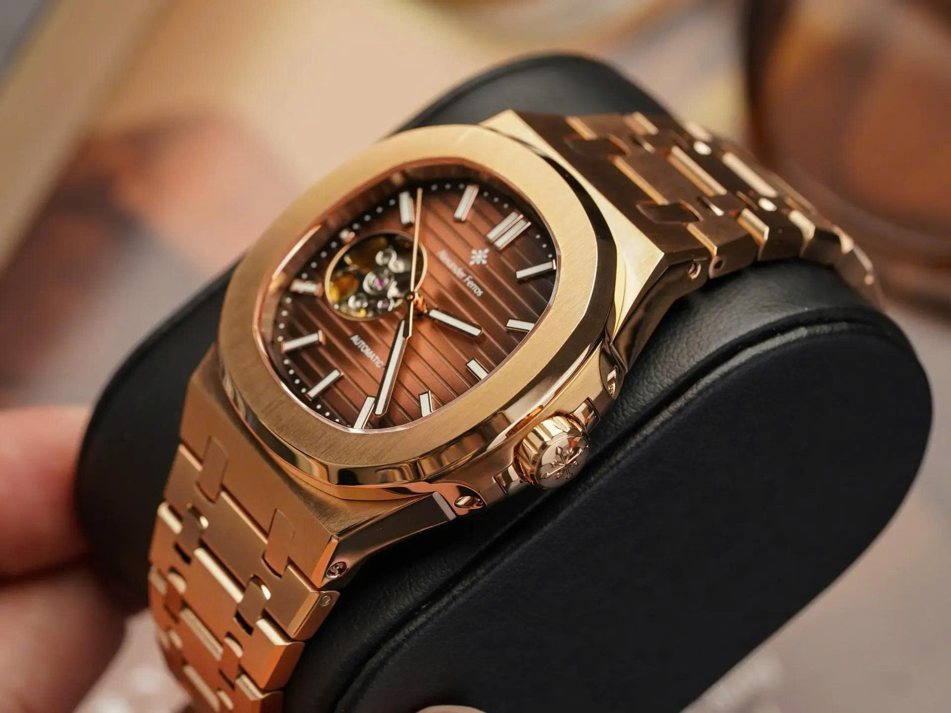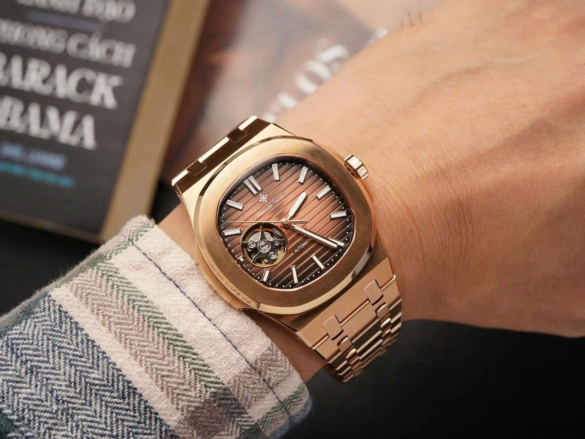 Dây da nâu vân cá sấu kết hợp vỏ vàng hồng và mặt số nâu gỗ sang trọng