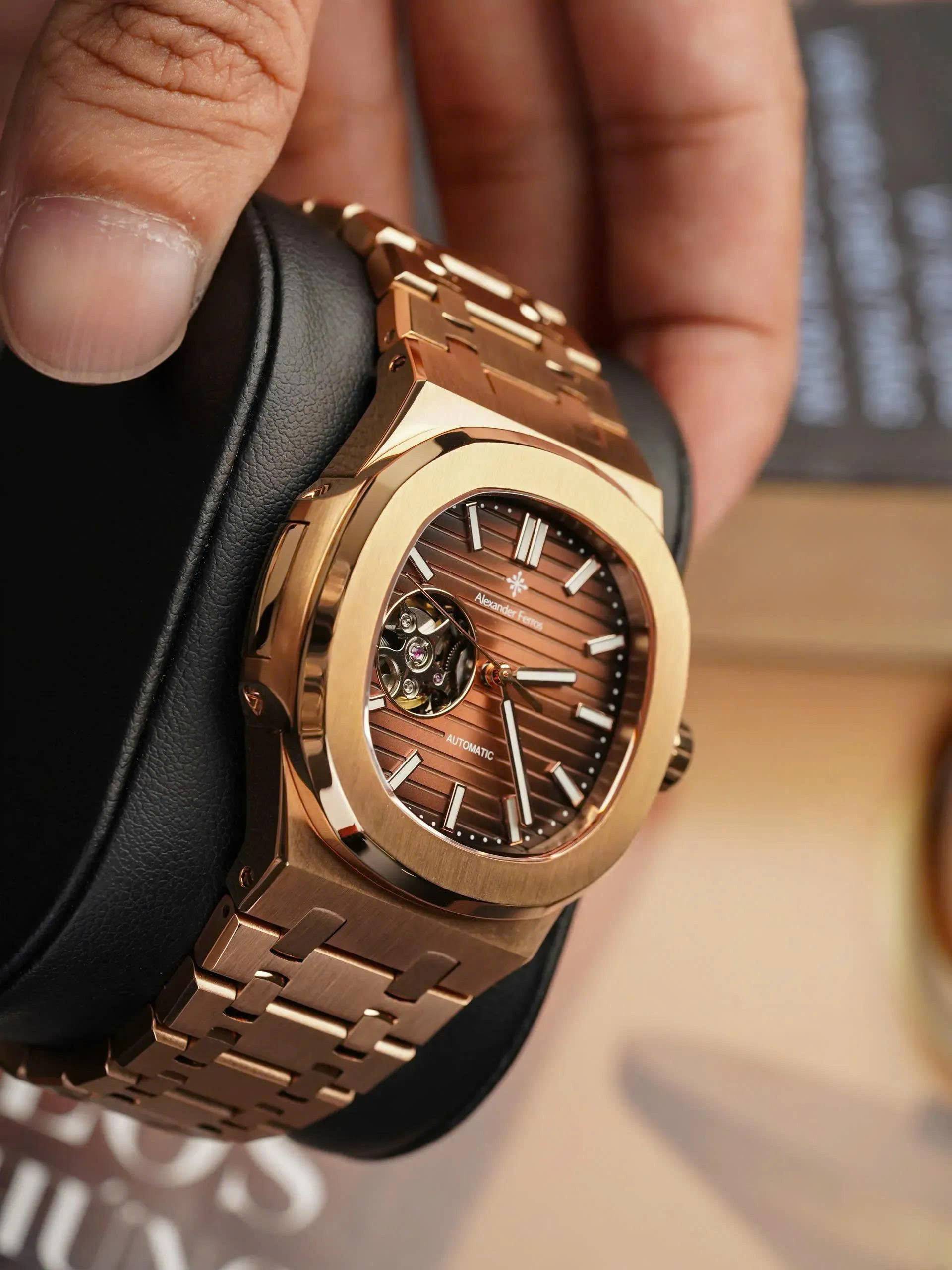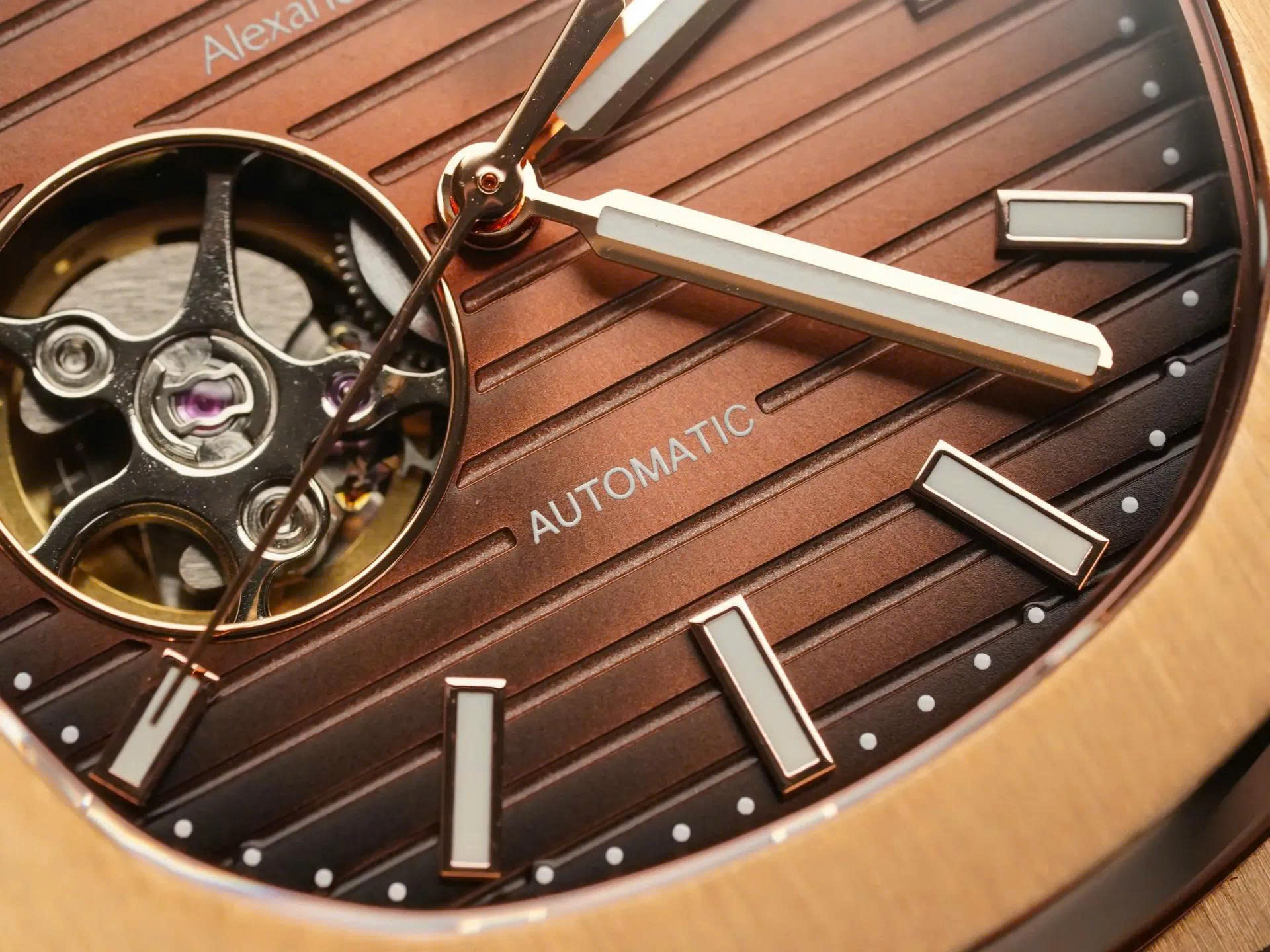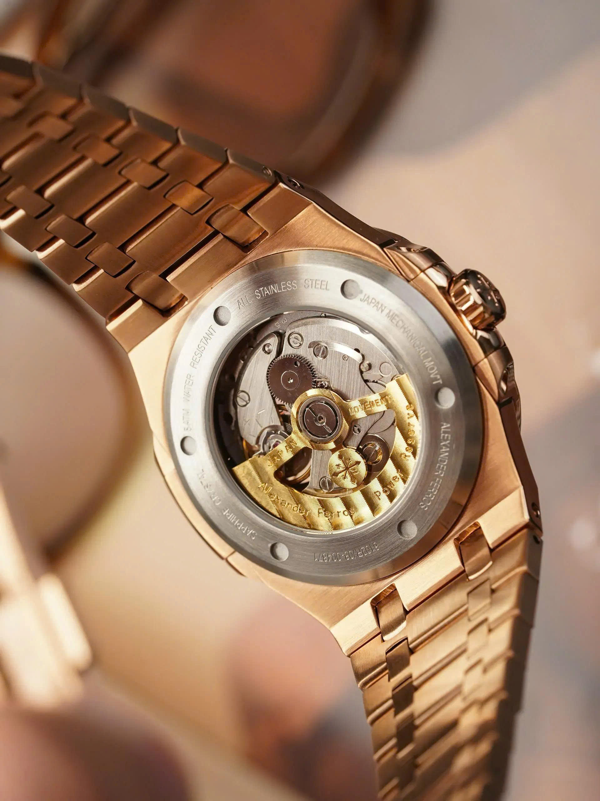 Thiết kế lộ cơ ở vị trí 9 giờ là điểm nhấn đặc biệt, cho phép người dùng chiêm ngưỡng chuyển động nhịp nhàng của bộ máy. Mặt kính sapphire chống xước, khung vỏ thép không gỉ mạ PVD cao cấp giúp nâng cao độ bền và vẻ sang trọng. Alexander Ferros 6102 không chỉ là công cụ đo thời gian mà còn là biểu tượng của gu thẩm mỹ và đẳng cấp cá nhân, phù hợp trong mọi dịp từ công sở đến sự kiện sang trọng.