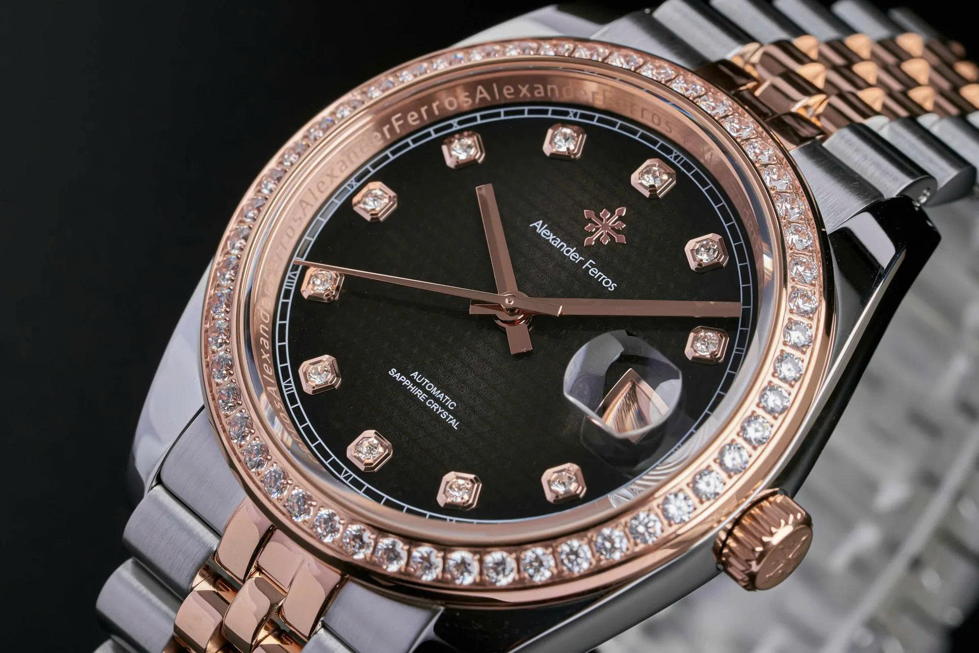 Alexander Ferros 5052 nổi bật với thiết kế tinh xảo, kết hợp giữa phong cách cổ điển và hiện đại. Vỏ đồng hồ được chế tác từ thép không gỉ cao cấp, chống trầy xước, bền bỉ với thời gian. Mặt kính sapphire trong suốt, chống lóa, bảo vệ cơ chế bên trong.