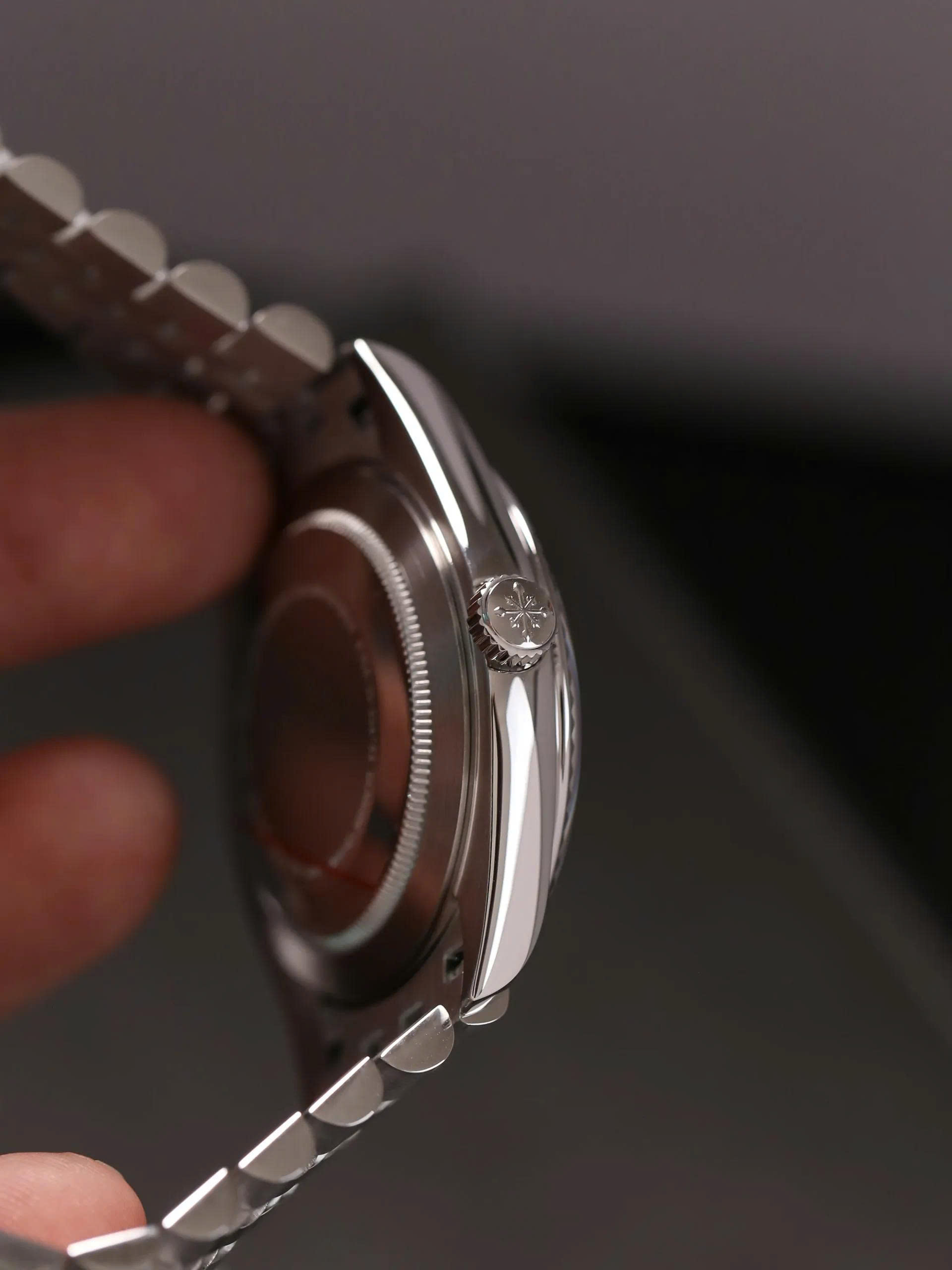 Kết hợp hoàn hảo với dây kim loại demi bạc sáng bóng, tạo nên tổng thể mạnh mẽ và đẳng cấp. Vành đồng hồ dạng rãnh truyền thống kết hợp cọc số đính đá nổi bật, mang đến vẻ đẹp vừa cổ điển vừa hiện đại. Mặt số tích hợp lịch ngày tại vị trí 3 giờ, tiện dụng cho người dùng trong sinh hoạt hàng ngày.