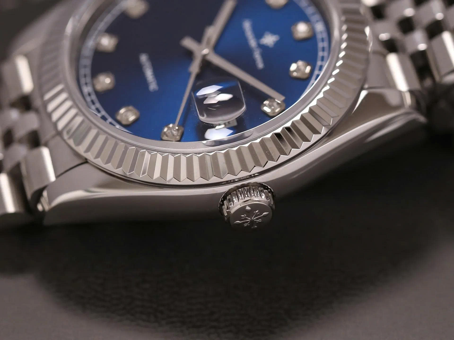 Kết hợp hoàn hảo với dây kim loại demi bạc sáng bóng, tạo nên tổng thể mạnh mẽ và đẳng cấp. Vành đồng hồ dạng rãnh truyền thống kết hợp cọc số đính đá nổi bật, mang đến vẻ đẹp vừa cổ điển vừa hiện đại. Mặt số tích hợp lịch ngày tại vị trí 3 giờ, tiện dụng cho người dùng trong sinh hoạt hàng ngày.