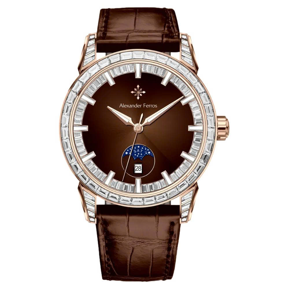 Thiết kế đính đá là điểm nhấn đặc biệt, mặt kính sapphire chống xước, khung vỏ thép không gỉ mạ PVD cao cấp giúp nâng cao độ bền và vẻ sang trọng. Alexander Ferros 9081 không chỉ là công cụ đo thời gian mà còn là biểu tượng của gu thẩm mỹ và đẳng cấp cá nhân, phù hợp trong mọi dịp từ công sở đến sự kiện sang trọng.