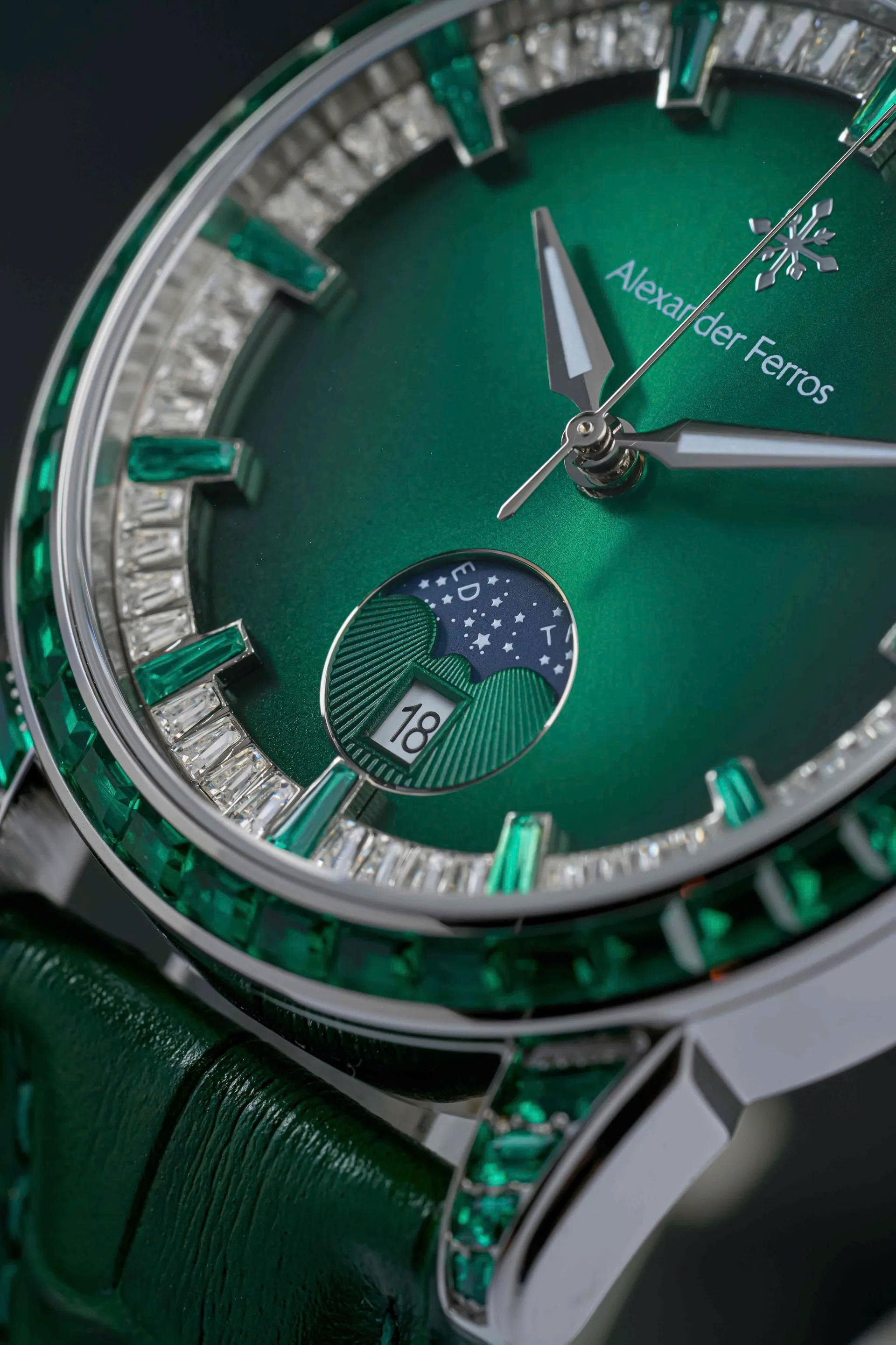 Thiết kế đính đá là điểm nhấn đặc biệt, mặt kính sapphire chống xước, khung vỏ thép không gỉ mạ PVD cao cấp giúp nâng cao độ bền và vẻ sang trọng. Alexander Ferros 9081 không chỉ là công cụ đo thời gian mà còn là biểu tượng của gu thẩm mỹ và đẳng cấp cá nhân, phù hợp trong mọi dịp từ công sở đến sự kiện sang trọng.