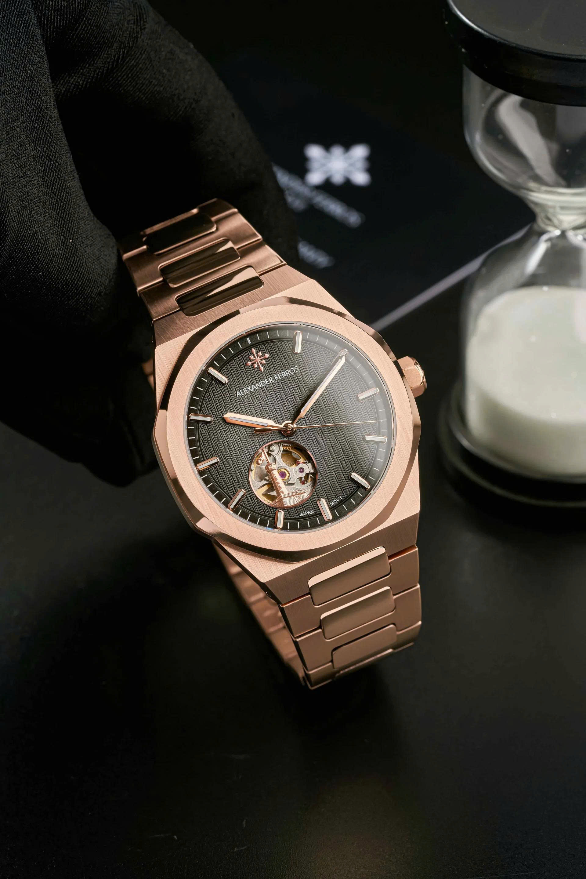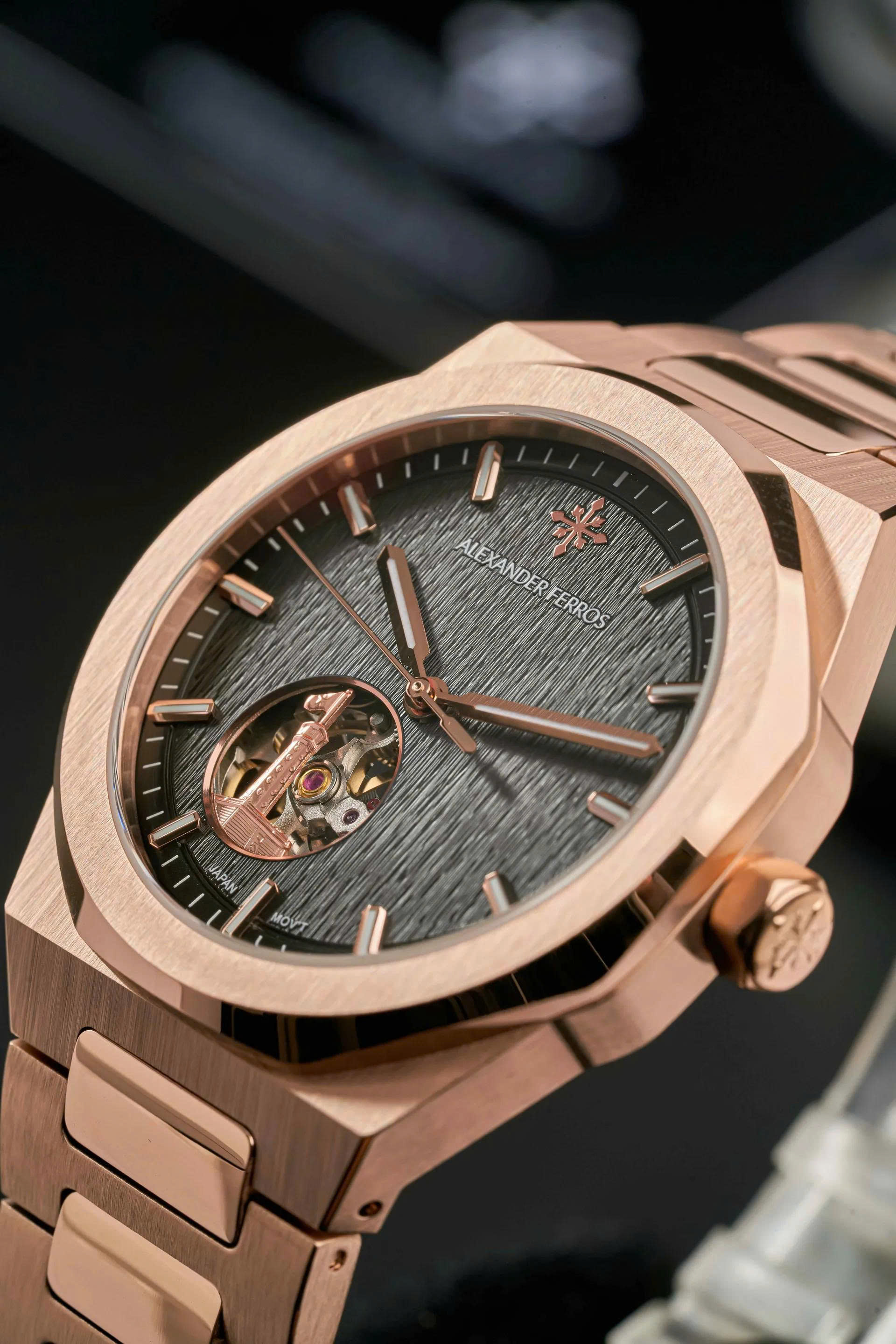 Alexander Ferros 9292 là mẫu đồng hồ nam nổi bật với phong cách thể thao lịch lãm và thiết kế hiện đại. Mặt số với nhiều phiên bản màu được trang trí bằng họa tiết vân gỗ độc đáo, kết hợp cùng bộ kim và cọc số dạng vạch phủ dạ quang, giúp dễ dàng quan sát giờ trong điều kiện thiếu sáng. Điểm đặc biệt của mẫu này là thiết kế Open heart góc 7h kết hợp với hình ảnh Cột cờ Dinh Độc Lập mang bản sắc riêng.
