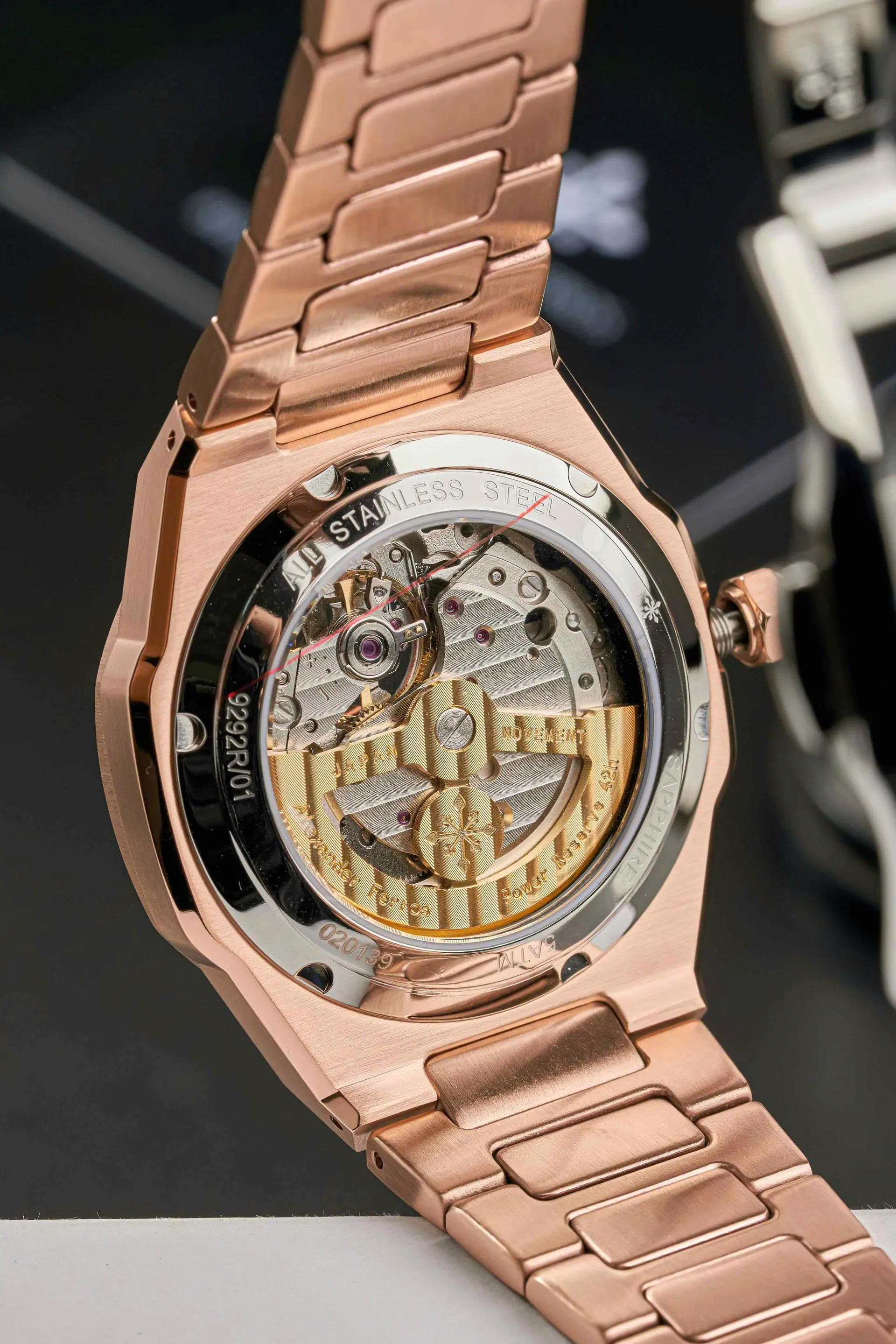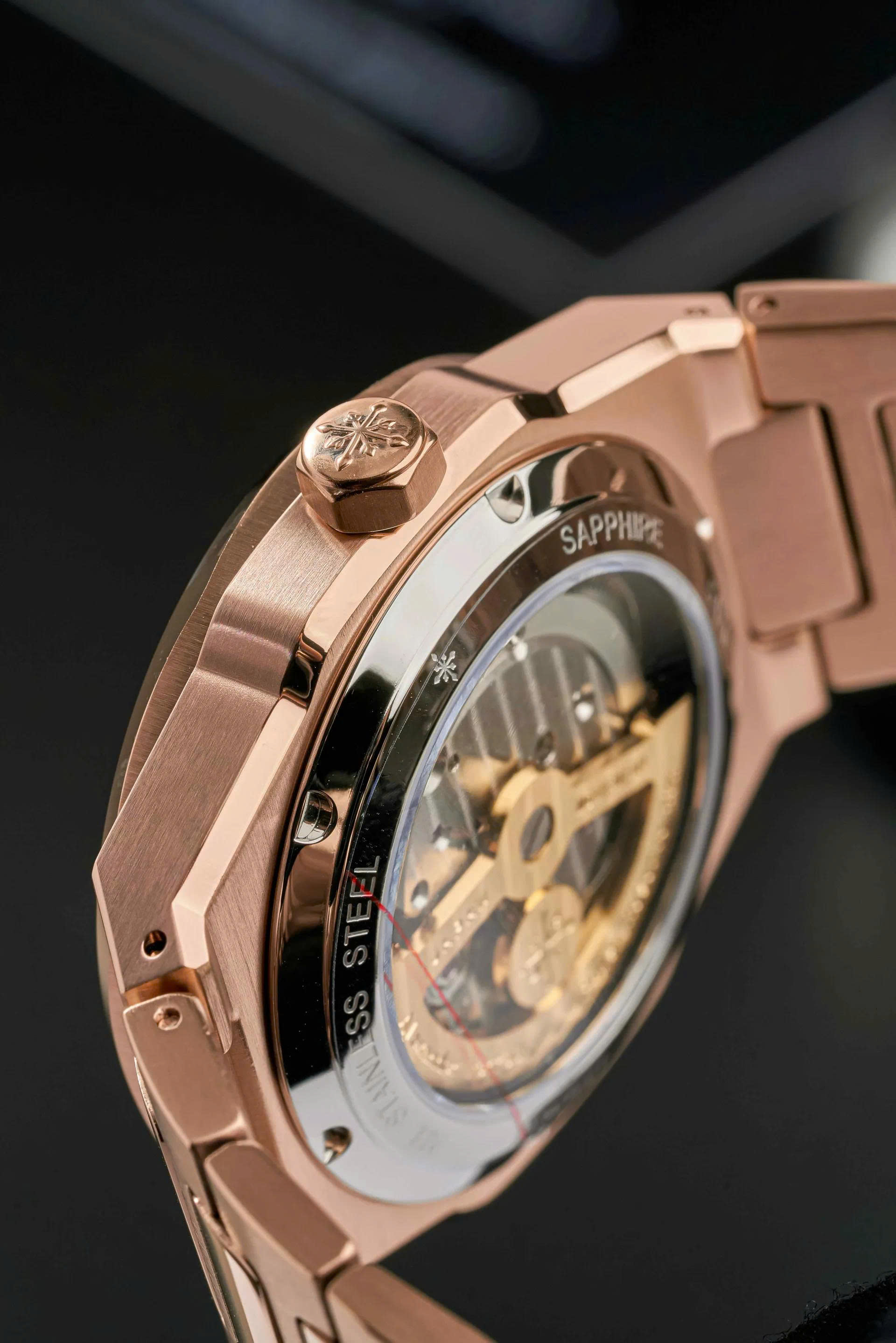 Vỏ được chế tác từ thép không gỉ cao cấp, mang đến sự bền bỉ và cảm giác chắc chắn khi đeo. Viền bezel cách điệu với các đường cắt góc cạnh, tăng thêm vẻ nam tính và năng động.