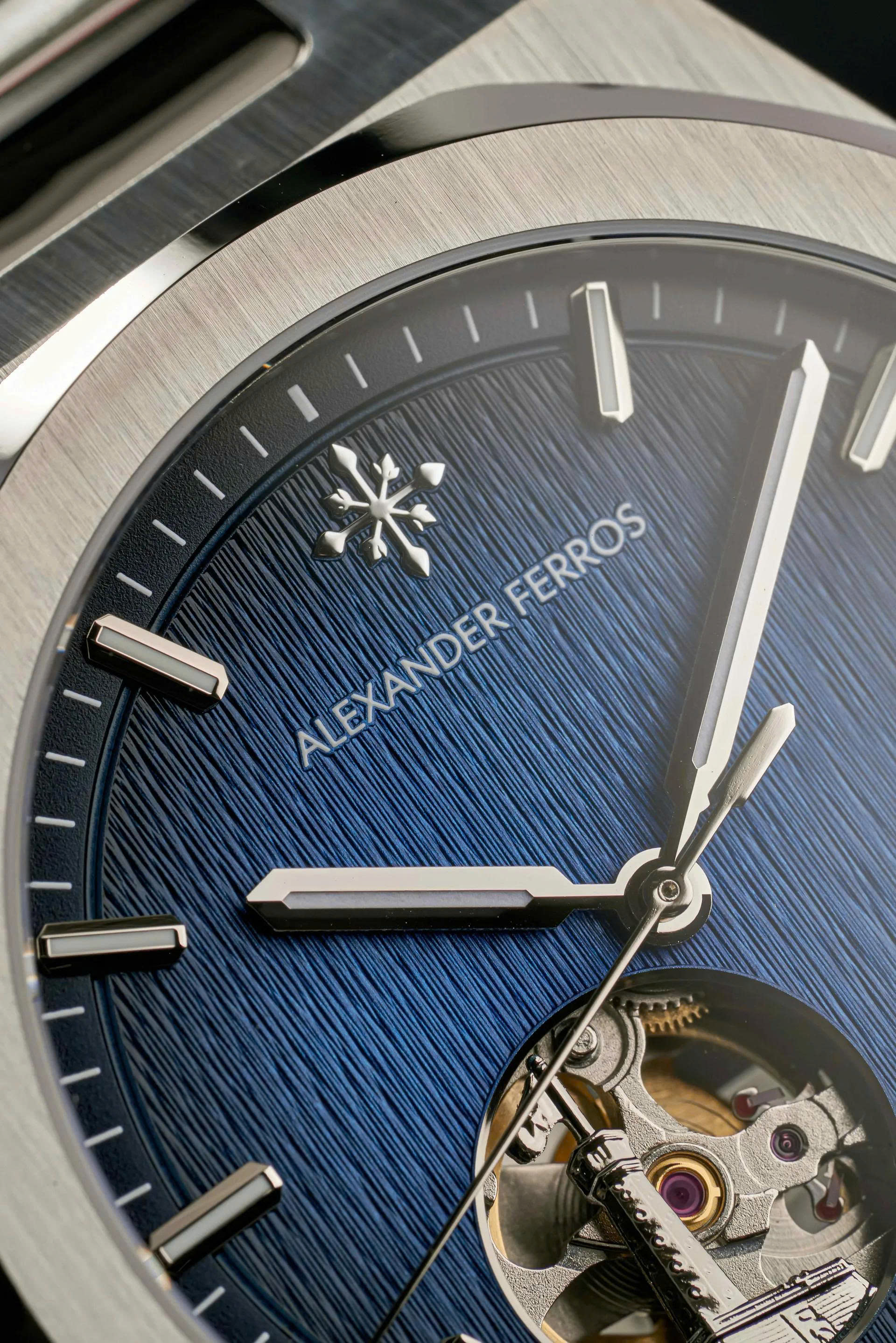 Alexander Ferros 9292 là mẫu đồng hồ nam nổi bật với phong cách thể thao lịch lãm và thiết kế hiện đại. Mặt số với nhiều phiên bản màu được trang trí bằng họa tiết vân gỗ độc đáo, kết hợp cùng bộ kim và cọc số dạng vạch phủ dạ quang, giúp dễ dàng quan sát giờ trong điều kiện thiếu sáng. Điểm đặc biệt của mẫu này là thiết kế Open heart góc 7h kết hợp với hình ảnh Cột cờ Dinh Độc Lập mang bản sắc riêng.