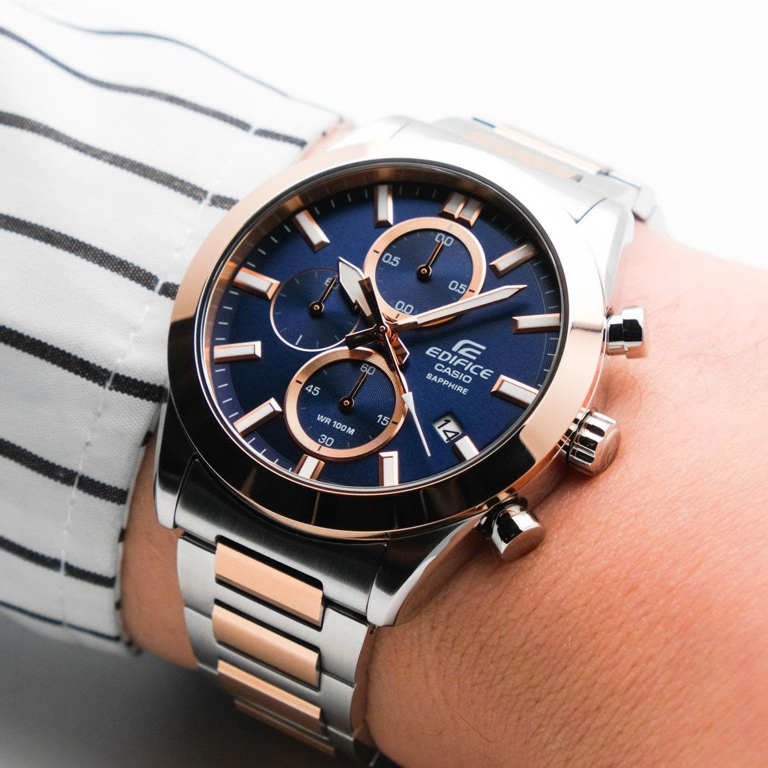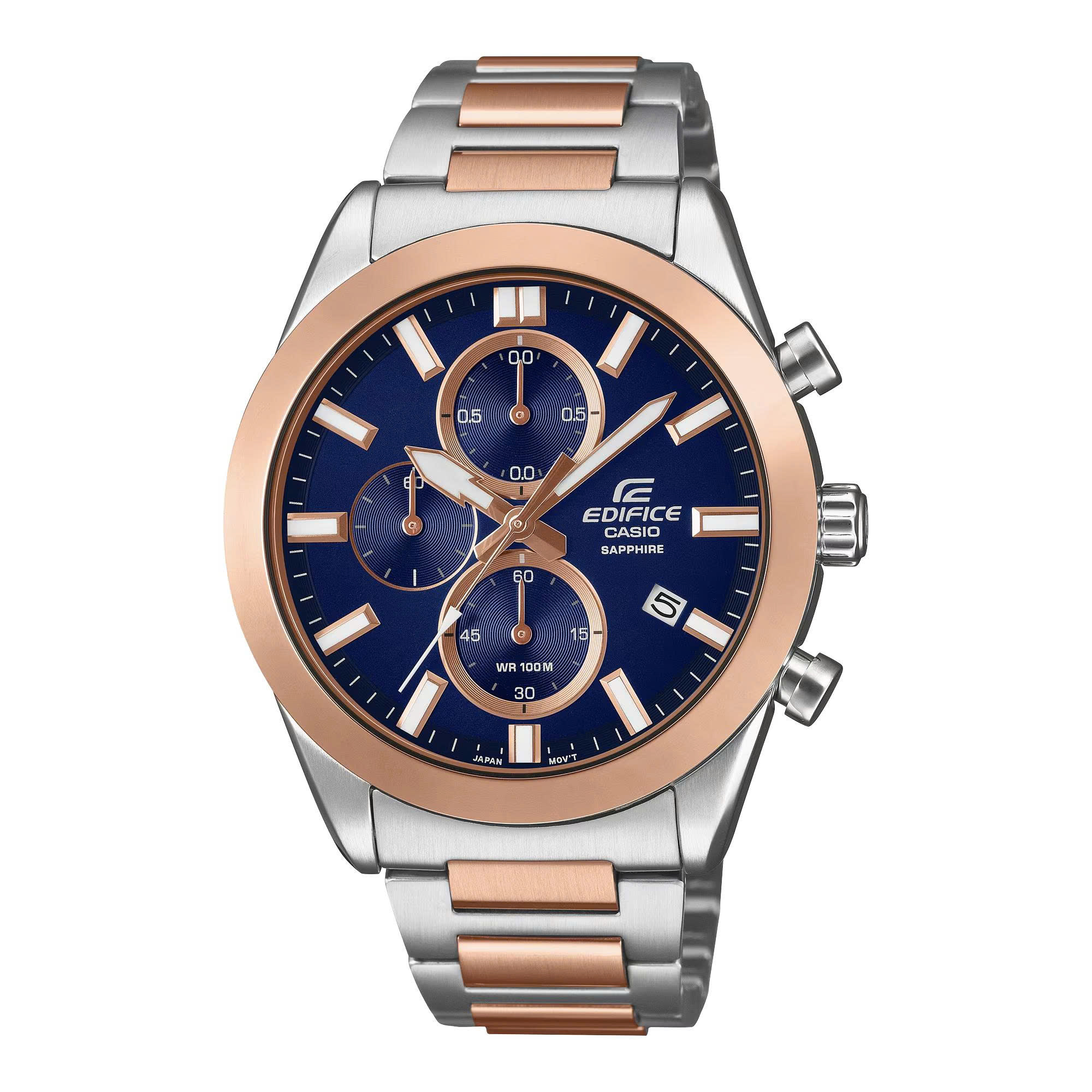 Xin chào tất cả những người đam mê xe hơi và thể thao tốc độ! Xin giới thiệu chiếc đồng hồ đeo tay EDIFICE hai tông màu bạc và vàng thời trang, tích hợp nhiều chức năng giúp bạn theo dõi đường đua cả ngày.