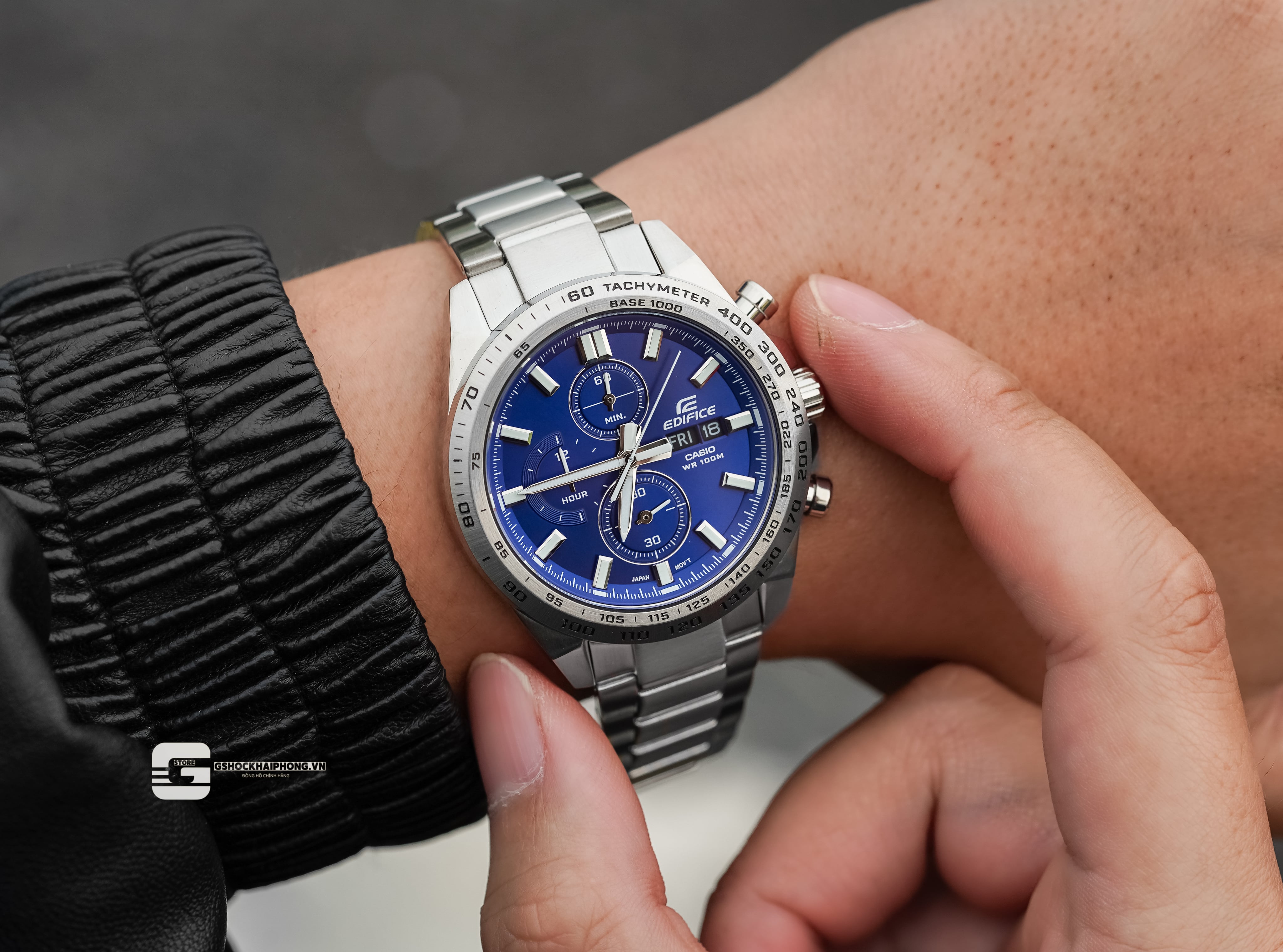 Thể hiện phong cách năng động, mạnh mẽ — đồng hồ ghi thời gian EDIFICE cổ điển trong một thiết kế tập trung vào thể thao. Kim giây có đường trung tâm màu xanh lá cây để nổi bật trên mặt số, với màn hình hiển thị thứ và ngày để tiện tham khảo.
