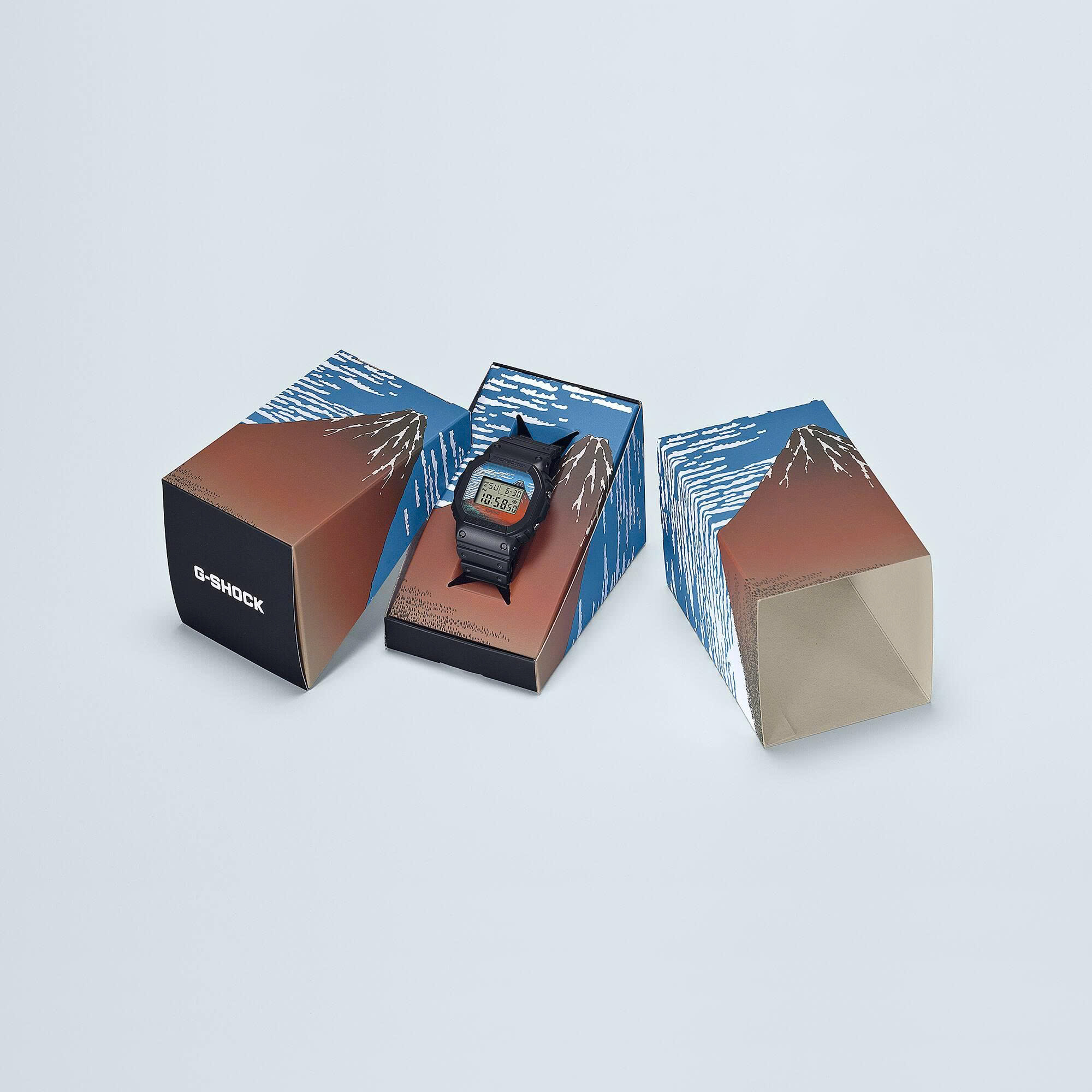 Hãy thỏa mãn niềm đam mê của bạn với núi Phú Sĩ và những kiệt tác Nhật Bản với những chiếc đồng hồ G-SHOCK tôn vinh nghệ sĩ ukiyo-e (tranh Phù Thế) nổi tiếng thế giới Katsushika Hokusai thời Edo. Thiết kế G-SHOCK bắt mắt với bức tranh Gió lặng, Trời xanh, một trong những bản in khắc gỗ từ bộ tác phẩm phong cảnh Ba mươi sáu cảnh núi Phú Sĩ mà họa sĩ ukiyo-e Hokusai và Nhật Bản nổi tiếng khắp nơi. Trong bộ sưu tập tác phẩm này, Hokusai lấy núi Phú Sĩ, biểu tượng không thể nhầm lẫn của Nhật Bản, làm chủ đề, khắc họa ngọn núi hùng vĩ từ 36 góc nhìn khác nhau. Những bản in lừng lẫy này không chỉ mang về cho nghệ sĩ khắc gỗ bậc thầy danh tiếng thế giới, mà còn tạo nên một thể loại ukiyo-e hoàn toàn mới — tranh phong cảnh. Chỉ có một tác phẩm kinh điển được yêu thích như chiếc đồng hồ kỹ thuật số DW-5600 mới đủ sức làm nổi bật những tác phẩm biểu tượng của Hokusai, chiếm vị trí trung tâm trên mặt số. Nhấn nút đèn để thấy chữ 日本, ký tự tiếng Nhật của Nhật Bản, hiện ra. Những ký tự tiếng Nhật này cũng được khắc trên vỏ sau. Là nơi khai sinh của tranh ukiyo-e và G-SHOCK, việc những chiếc đồng hồ này được sản xuất tại Nhật Bản là điều hoàn toàn hợp lý.