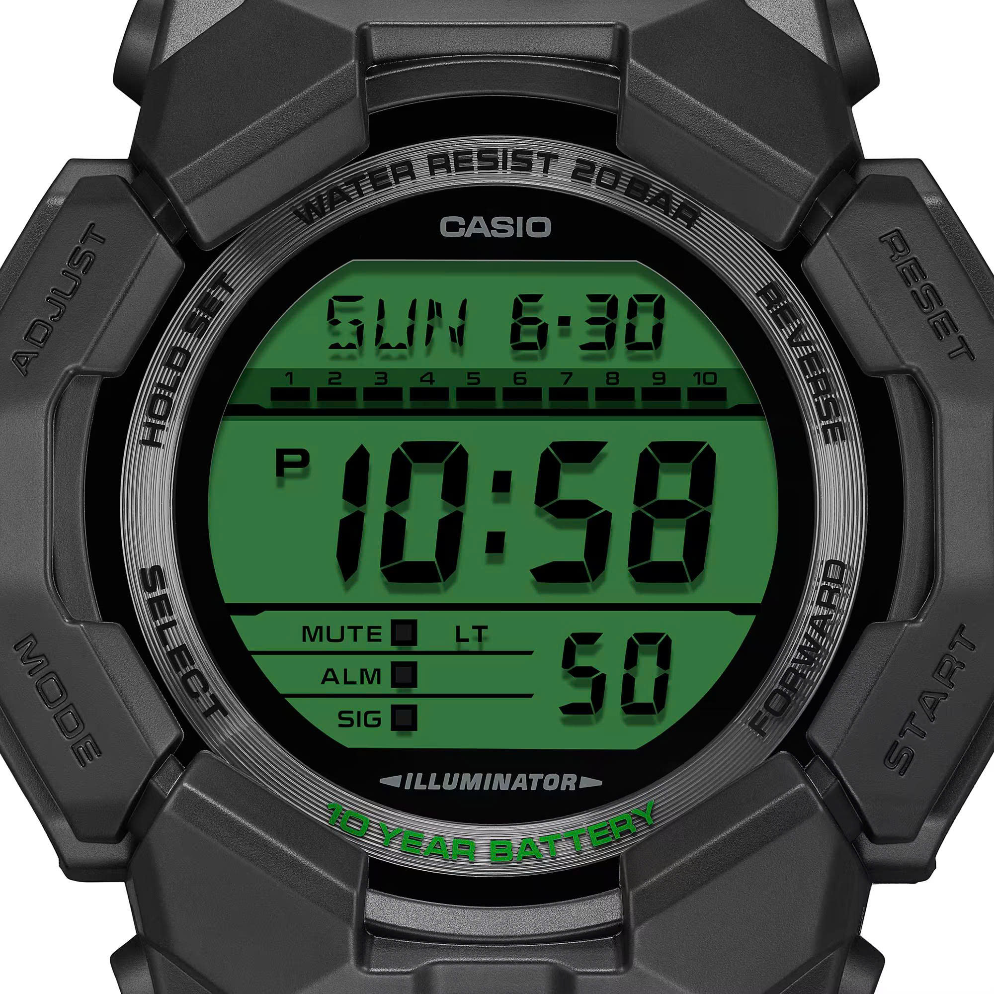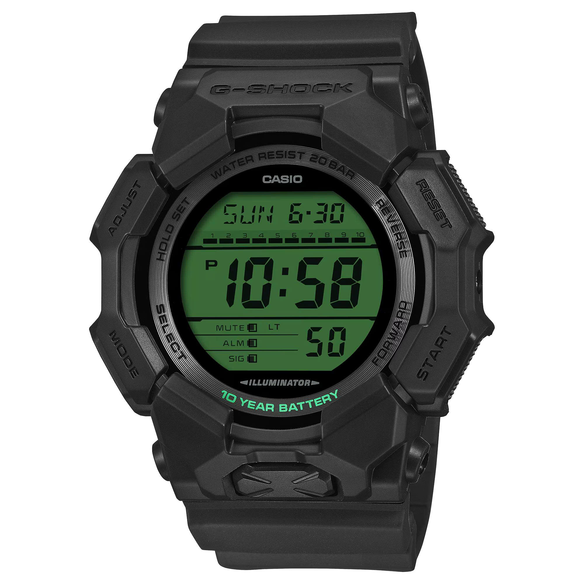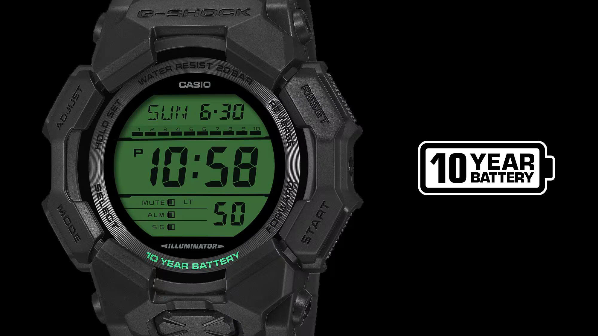 Với màn hình LCD được in điểm xuyết màu xanh lá cây điện tử, nổi bật trên nền viền, dây đeo và mặt số màu đen G-SHOCK, đây là thiết kế trực quan táo bạo, gây ấn tượng và tràn đầy năng lượng.