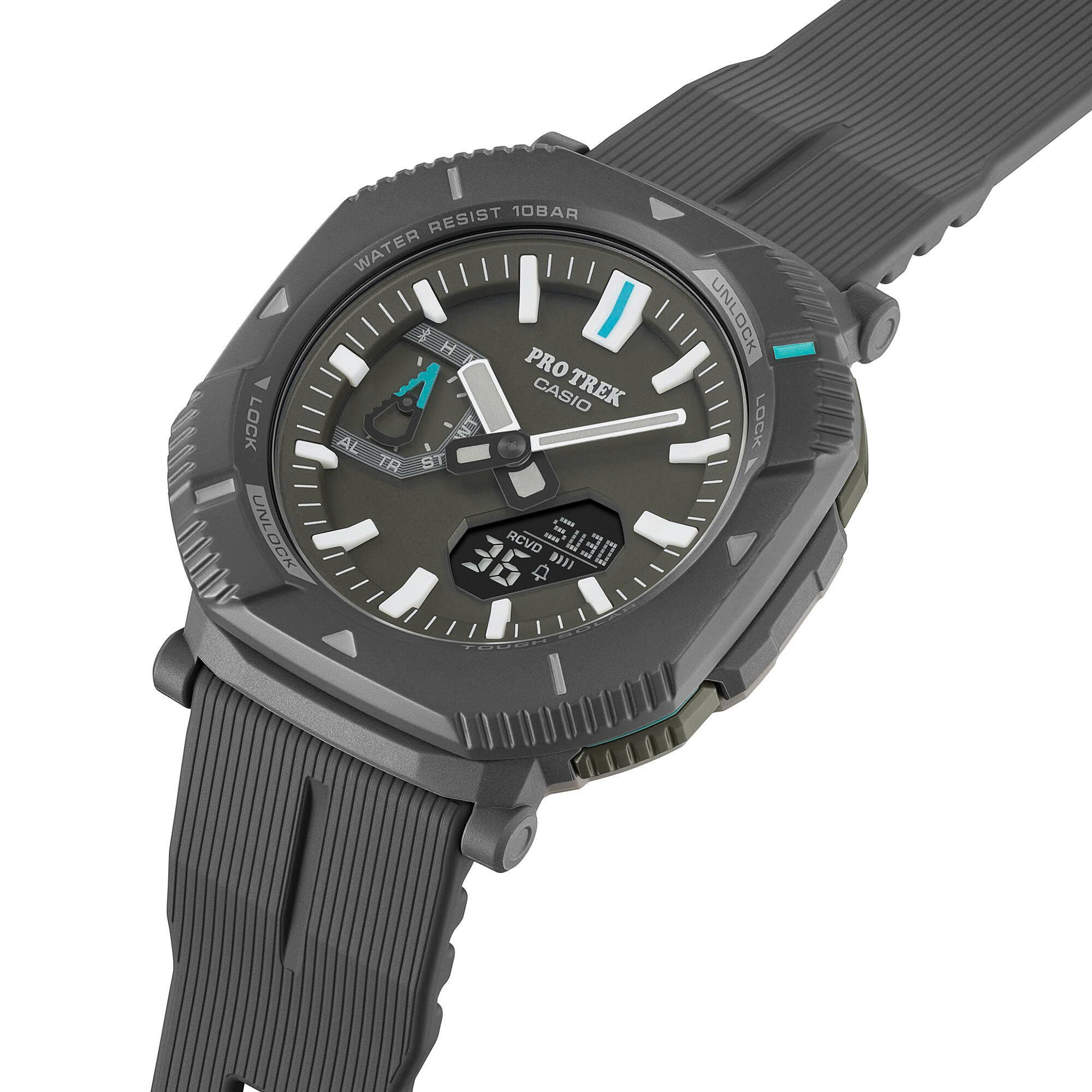 PRJ-B001 nâng tầm thiết bị lên một tầm cao mới với gờ bảo vệ xoay đầu tiên trong dòng PRO TREK. Xoay gờ xoay để chuyển đổi giữa hai phong cách riêng biệt. Khi được đặt để thể hiện một thiết kế góc cạnh đầy phong cách, bổ sung cho phong cách thời trang hàng ngày, gờ bao phủ các nút, ngăn ngừa việc vô tình nhấn nút khi đi bộ ra ngoài hoặc trong thị trấn. Xoay gờ 45 độ để đồng hồ trông tròn hơn và mở các nút để dễ dàng truy cập chức năng khi đi bộ đường dài hoặc tập luyện.