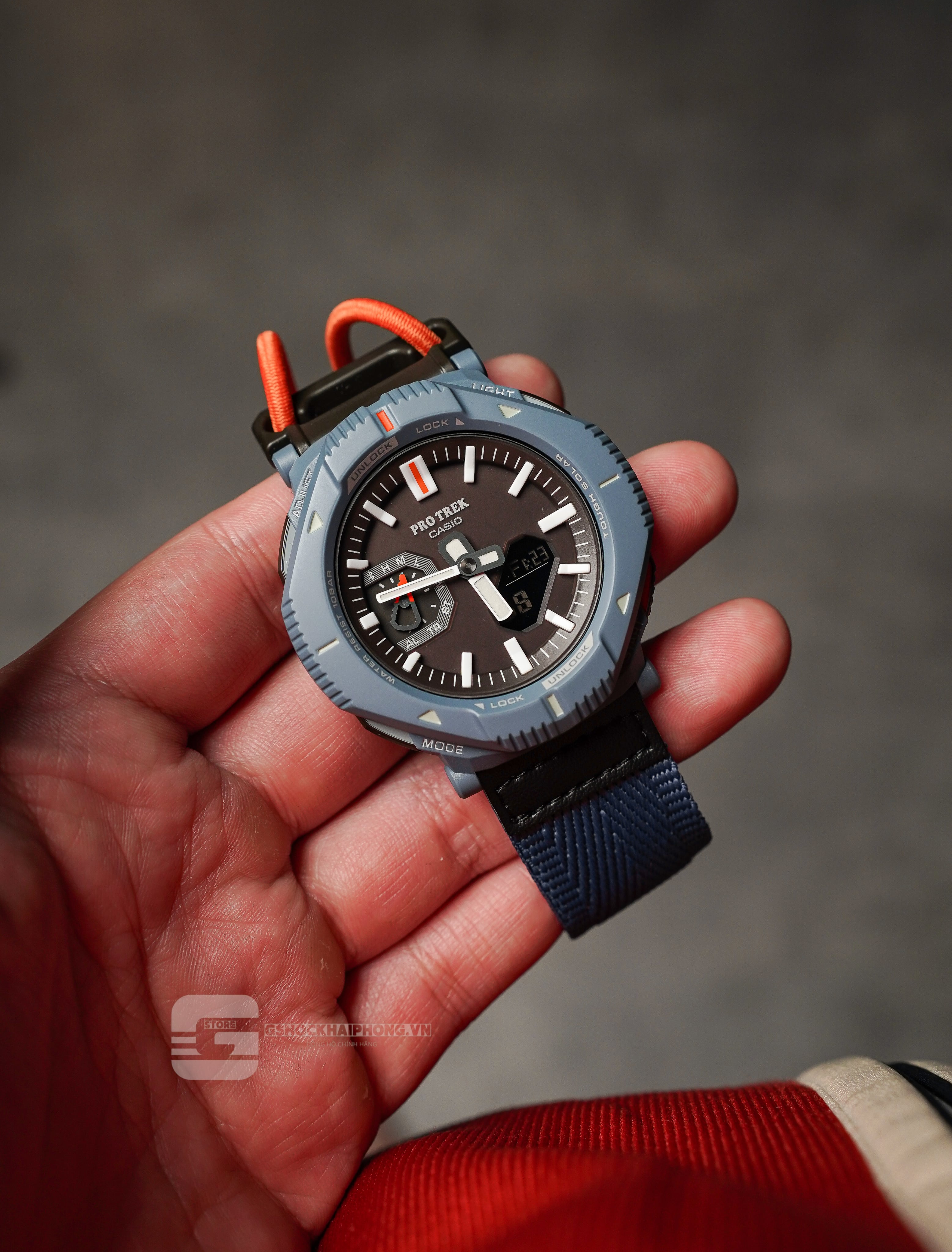 Với màu xanh bụi bặm để hòa hợp đẹp mắt với thiên nhiên, cùng những điểm nhấn màu huỳnh quang trên mặt số và gờ, chiếc đồng hồ này được thiết kế để bổ sung cho phong cách thời trang ngoài trời.