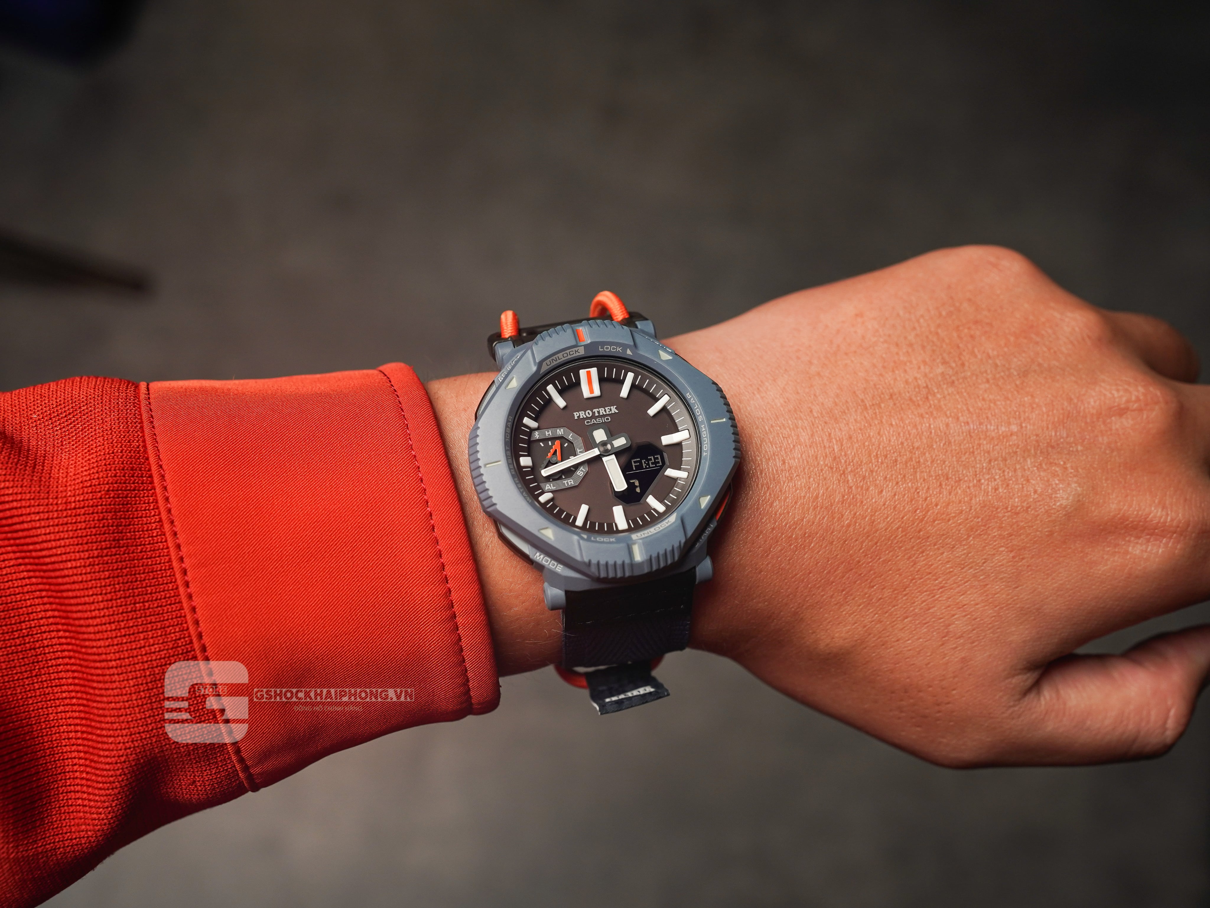 PRJ-B001 nâng tầm thiết bị lên một tầm cao mới với gờ bảo vệ xoay đầu tiên trong dòng PRO TREK. Xoay gờ xoay để chuyển đổi giữa hai phong cách riêng biệt. Khi được đặt để thể hiện một thiết kế góc cạnh đầy phong cách, bổ sung cho phong cách thời trang hàng ngày, gờ bao phủ các nút, ngăn ngừa việc vô tình nhấn nút khi đi bộ ra ngoài hoặc trong thị trấn. Xoay gờ 45 độ để đồng hồ trông tròn hơn và mở các nút để dễ dàng truy cập chức năng khi đi bộ đường dài hoặc tập luyện.