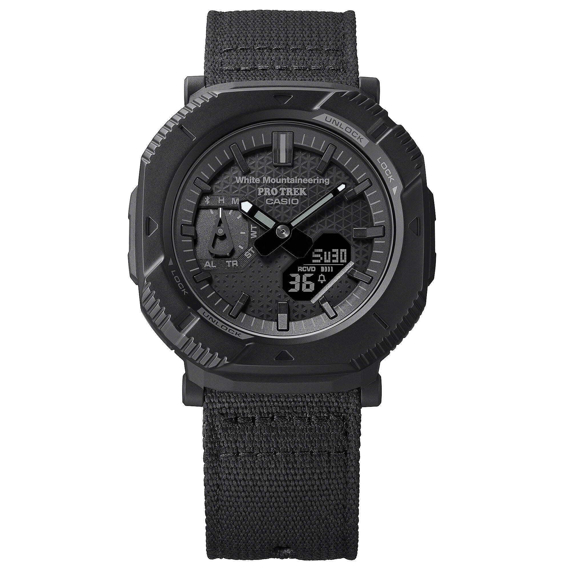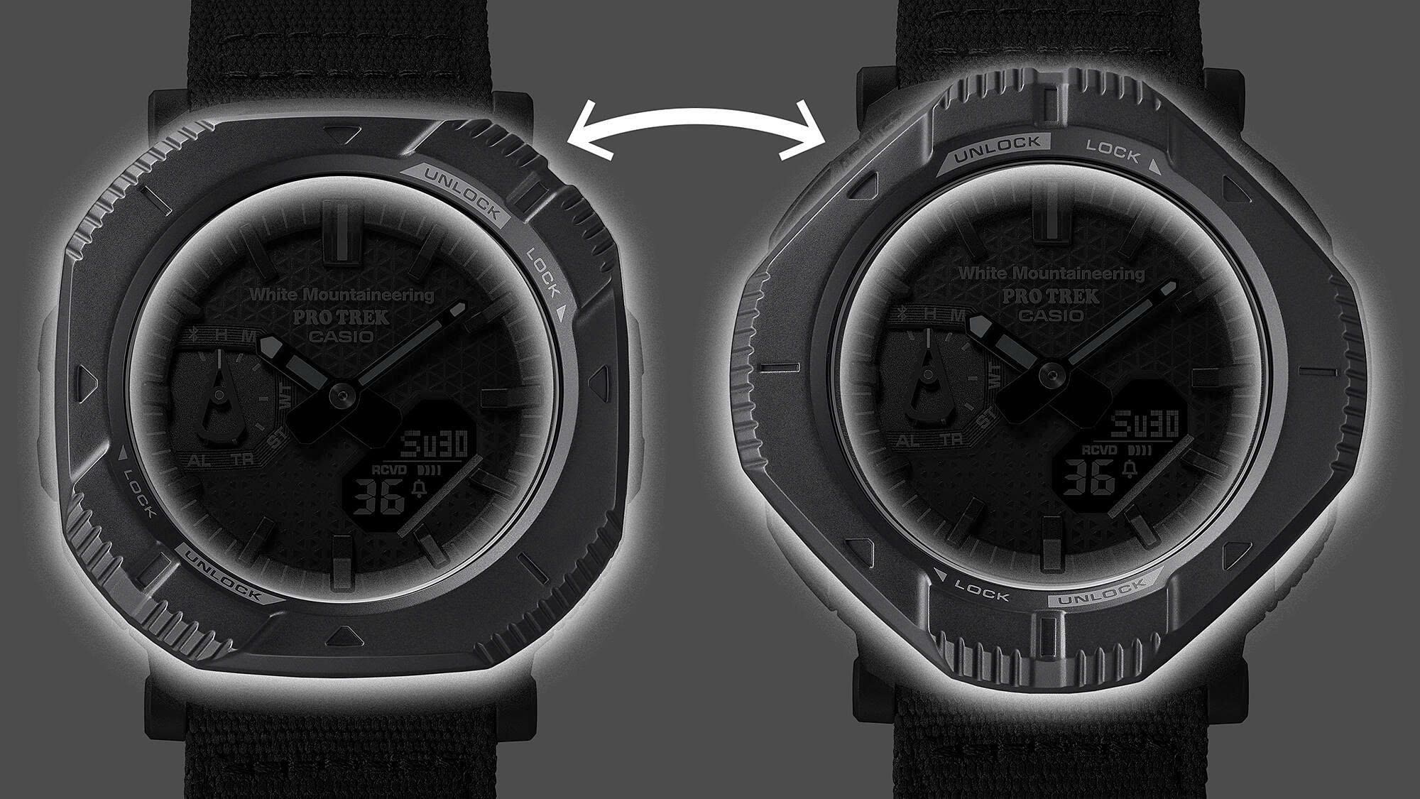 PRJ-B001 nâng tầm thiết bị lên một tầm cao mới với gờ bảo vệ xoay đầu tiên trong dòng PRO TREK. Xoay gờ xoay để chuyển đổi giữa hai phong cách riêng biệt. Khi được đặt để thể hiện một thiết kế góc cạnh đầy phong cách, bổ sung cho phong cách thời trang hàng ngày, gờ bao phủ các nút, ngăn ngừa việc vô tình nhấn nút khi đi bộ ra ngoài hoặc trong thị trấn. Xoay gờ 45 độ để đồng hồ trông tròn hơn và mở các nút để dễ dàng truy cập chức năng khi đi bộ đường dài hoặc tập luyện.