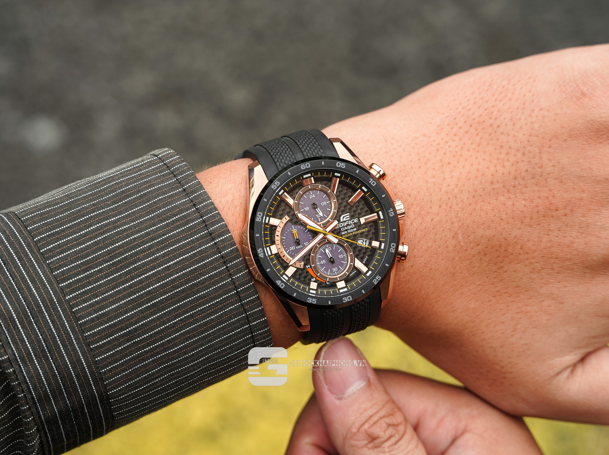 Mặt đồng hồ làm từ chất liệu sợi cacbon tương tự chất liệu dùng trong cấu trúc xe ô tô đua. Họa tiết vải dệt độc đáo của chất liệu này tạo nên dáng vẻ thể thao
