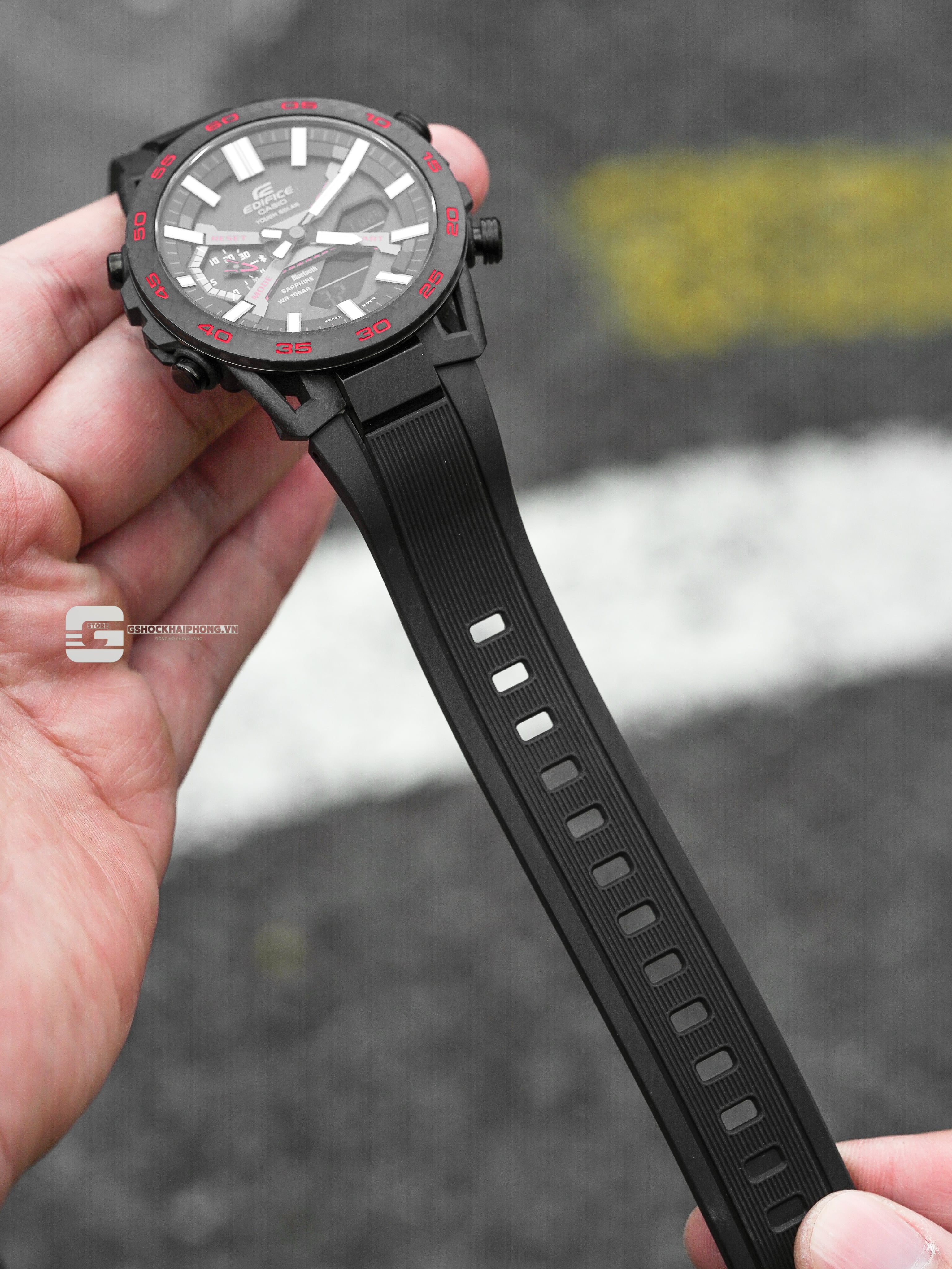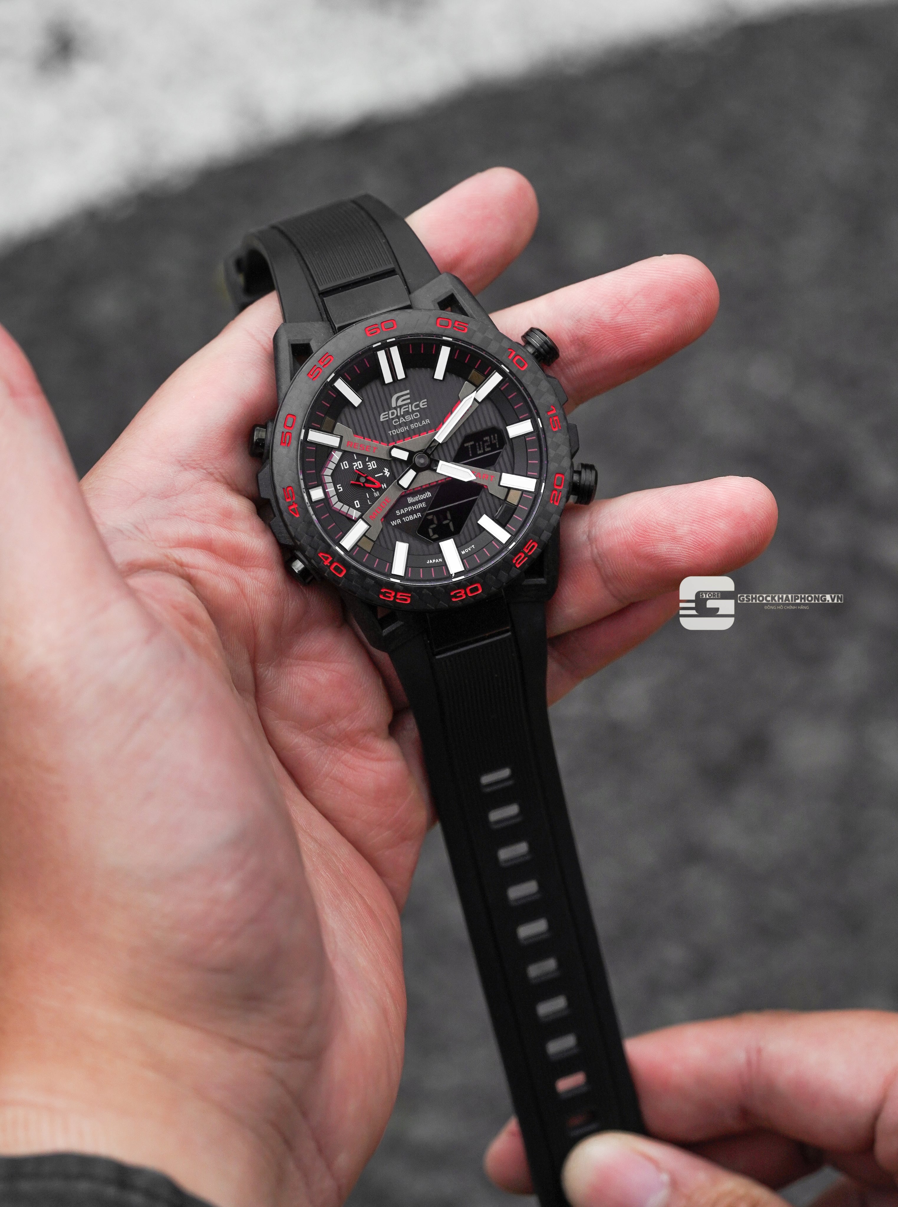 Thiết kế Carbon Core Guard hiện đại, tông đen mạnh mẽ và đầy chiều sâu. Trang bị mặt kính Sapphire cùng công nghệ Bluetooth và Tough Solar – sự kết hợp giữa thể thao và công nghệ cao trong một tổng thể đậm chất tình thần Edifice.