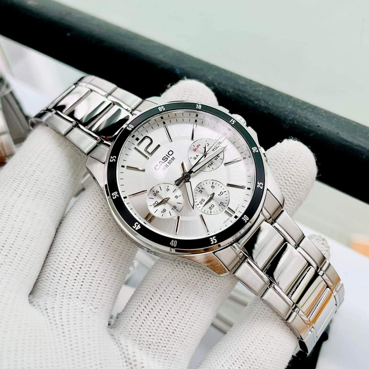 Mặt số (Dial): Điểm nhấn nằm ở 3 mặt số phụ (sub-dial) được sắp xếp cân đối. Khác với đồng hồ Chronograph thông thường dùng để bấm giờ, MTP-1374 sử dụng các mặt số này để hiển thị lịch thứ, lịch ngày và chế độ 24 giờ. Điều này giúp mặt đồng hồ trông phức tạp, nam tính và đầy chiều sâu.