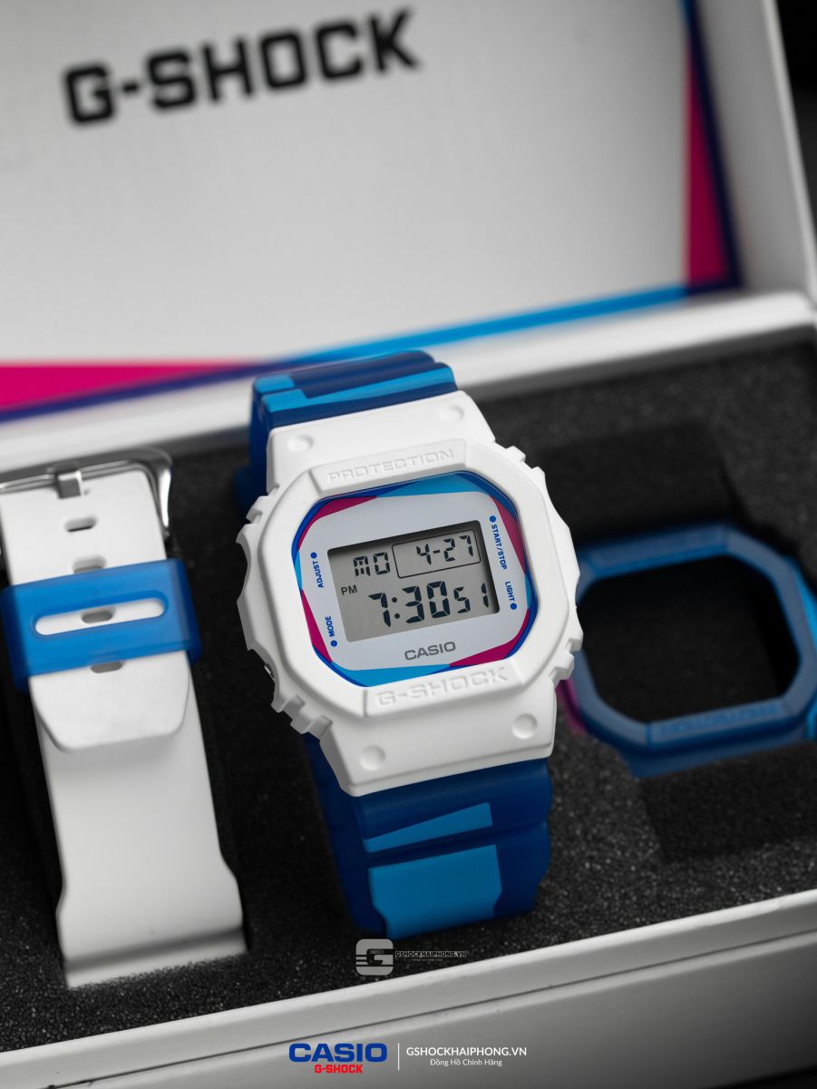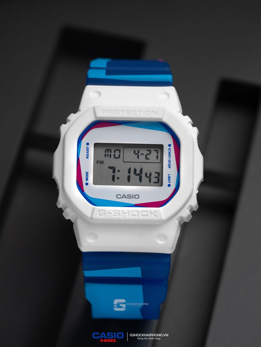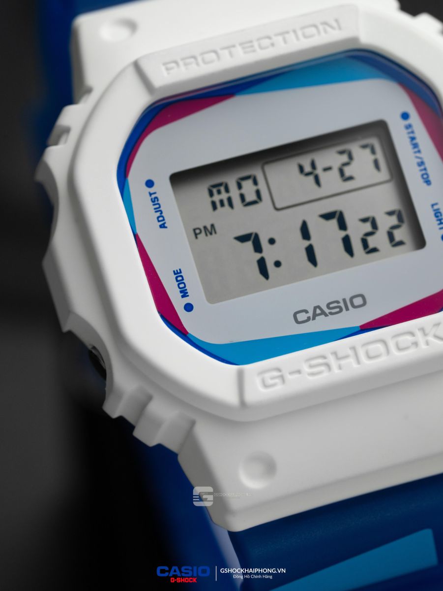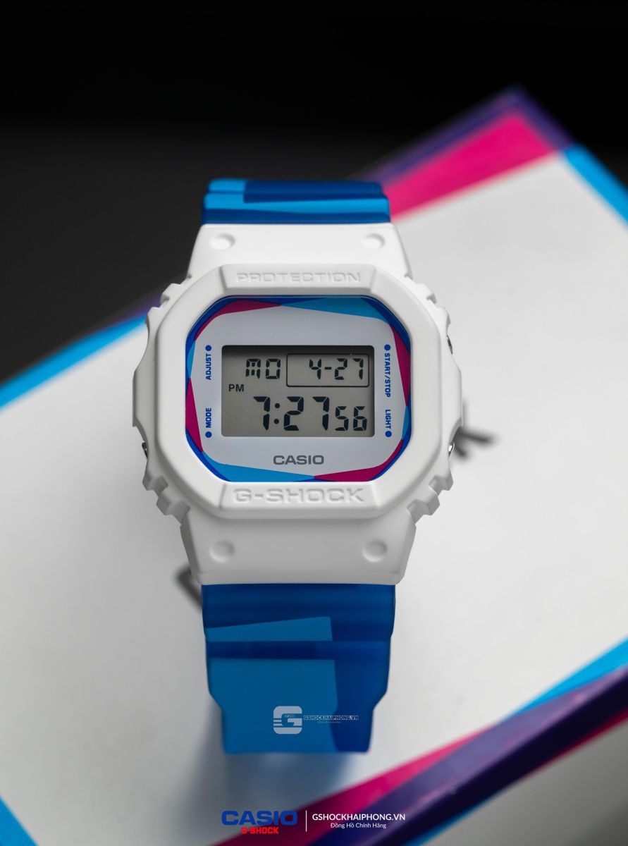 - Ngay từ cái nhìn đầu tiên, DWE-5600PR gây ấn tượng mạnh bởi sự phối hợp màu sắc không theo quy tắc thông thường. Lấy cảm hứng từ phong cách "Papercraft" hoặc những khối màu sắc rực rỡ thường thấy trong nghệ thuật Pop-art, chiếc đồng hồ này là một bản hòa ca giữa các tông màu xanh dương, hồng và trắng.